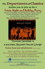 The Department of Classics held a Classics Trivia Night followed by a holiday party on Thurs., Dec. 5, at Blaustein Faculty Lounge. Pizza, holiday cupcakes and other festive treats were served. Questions for jeopardy were drawn from the following categories: mythology, Greek and Roman history culture, Greek and Latin literature, Greek and Roman art and architecture. Upon arrival students were divided into teams; game ran from 4.45-5.30 pm and two winners got a copy of the abridged Oxford Classical Dictionary as a prize!