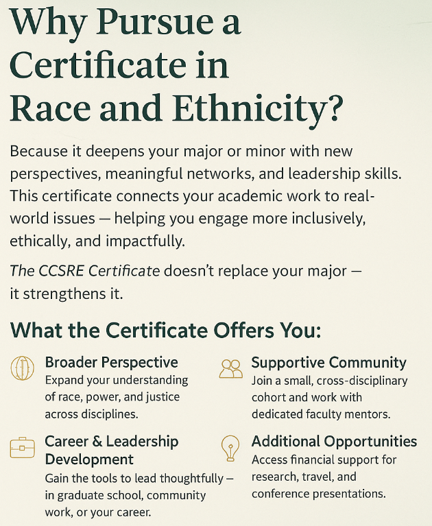 Our Certificate Program offers students from every major an opportunity to undertake sustained critical study of race and ethnicity. The certificate program is based on six principles: reciprocity, continuity, community, reflexivity, resistance, and scholarly engagement. The certificate is designed to create an interdisciplinary environment for theoretically informed study and praxis. The certificate program also institutionalizes the efforts of scholars and students involved in the Center.