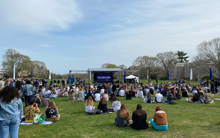 Students, faculty and staff gathered on the glorious expanse of Tempel Green this afternoon as President Katherine Bergeron and trustee leadership joined to announce the largest philanthropic gift in the College’s history: a gift of $30 million from Karen Hale P’20 and Rob ’88 that, in combination with their prior gift of $20 million, invests $50 million in financial aid, athletics, career and an expansive 21st-century liberal arts education.