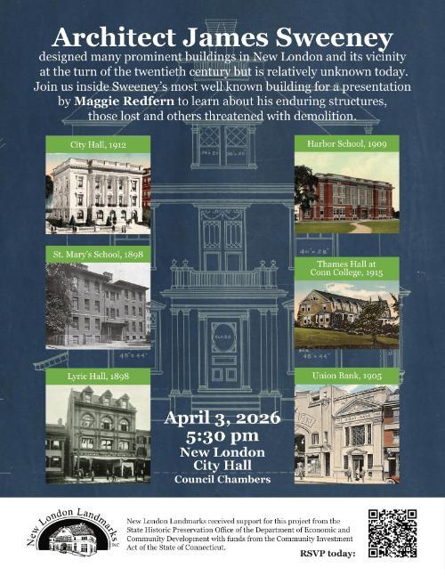 Architect James Sweeney designed many prominent buildings in New London and its vicinity at the turn of the twentieth century but is relatively unknown today. Join us inside Sweeney’s most well-known building for a presentation by Arboretum Director, Maggie Redfern to learn about his enduring structures, those lost and others threatened with demolition.