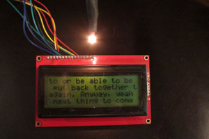 Reactive light and text piece, Arduinos, Wifi, breathe sensors, custom electronics, LCD, light, MP3 player, felt