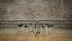The wind outside is the source of sound; it is the whisper that will disrupt silence. This work consists of a set of sixteen bottles – with air blowers attached to each one of them – and a wind vane. The vane is fixed outside of a window and detects the direction the wind is blowing. Inside of the room, the motor starts blowing air into the bottle that corresponds to that particular direction. This event generates a smooth sound, and each direction has its own pitch. The bottles are arranged in a circle, similar to the shape of the compass rose, depicting the eight principal winds and the eight half-winds.