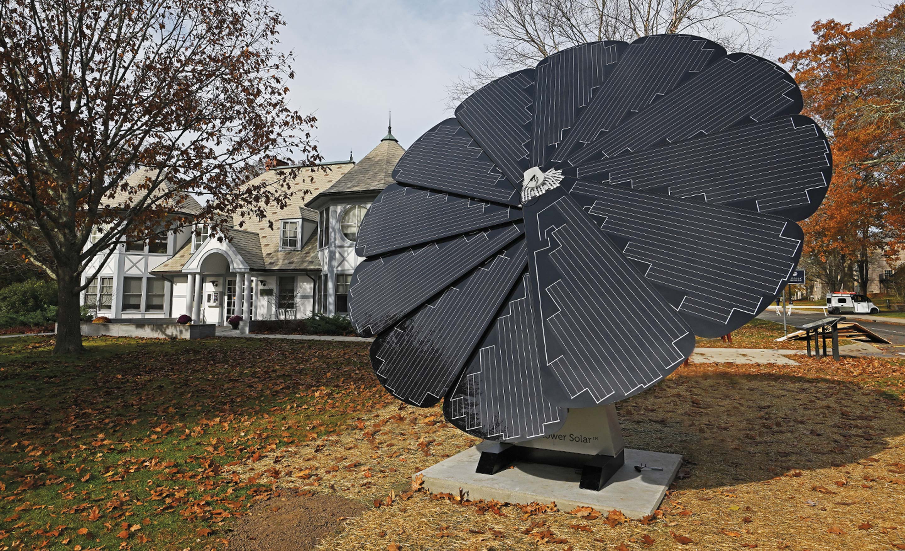 Conn’s SmartFlower, connected to the Woodworth House building, is expected to produce 5,000 kWh each year, or about 40% of the electricity needs of the building.