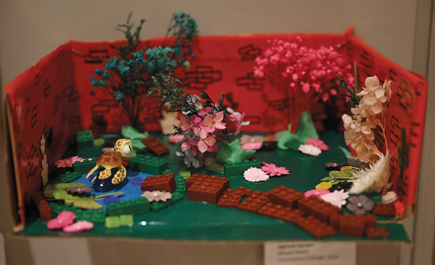 Alina Khan ’27, whose diorama is titled “Apricot Garden” and is decorated with green and red paint, miniature turtles, Legos and sprigs of colorful florals representing trees, said she was “fairly intimidated” by the project at first.