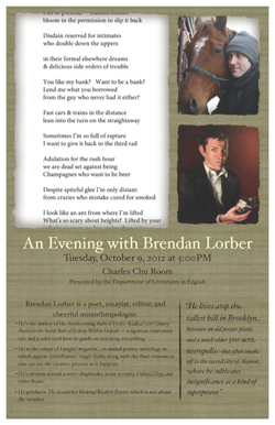 The Connecticut College Department of Literatures in English will host "An Evening with Brendan Lorber," a poet, essayist, editor and "cheerful misanthropologist," on Tuesday, Oct. 9, at 5 p.m. in the Charles Chu Asian Art Reading Room in Shain Library. Lorber is the author of the forthcoming book "Ruin & Desire: Radical 21st Century Poetics & the Secret Path of Ecstasy Within Despair," which he describes as a "rigorous cautionary tale and wild-eyed how-to guide on wrecking everything." He is also the editor of "Lungfull! Magazine," an annual poetry anthology in which contributors' rough drafts appear along with the final versions so readers can see the creative process as it happens. Lorber, who studied with Allen Ginsberg, has also taught workshops at the St. Marks Poetry Project, edited The Poetry Project Newsletter and has performed his work on NPR and PBS and at The New York City Fringe Festival, The National Arts Club and The Nuyorican Poet's Café. "Brendan Lorber is an important figure in New York's poetry scene," said Jeff Strabone, assistant professor of literatures in English at the College. "Although all of his work revolves around poetry, he wears many hats: poet, publisher, performer, series host and educator. And he brings poetry performance online in a unique way. The audience at our event will have a chance to take the pulse of American poetry in the 21st century, and it will be very cool." The English department is sponsoring "An Evening with Brendan Lorber" in part through the Ida Preston Gibson Memorial Fund. The event is free and open to the public. For more information, call 860-439-2350.