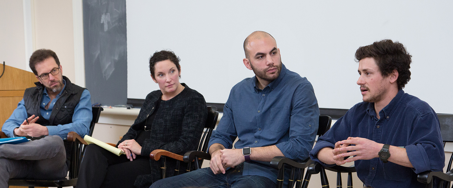 The panel, which drew an audience from campus and from the local communities, featured Rachel Black, visiting professor of anthropology at Connecticut College; Dan Giusti, founder of Brigaid and former chef at Noma, a two-Michelin-star restaurant in Copenhagen, Denmark; and Phil Haynes ’14, assistant livestock manager at Stone Barns Center.