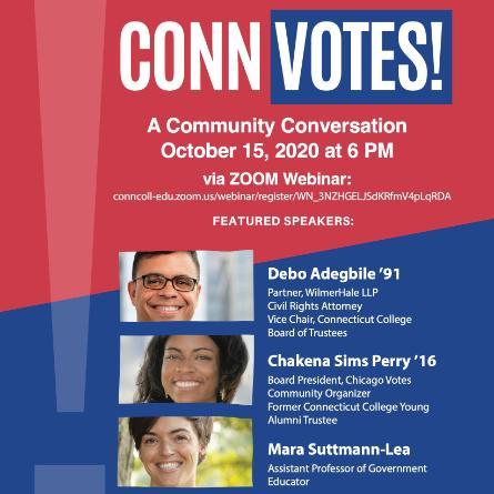 “The struggle does continue,” said Connecticut College President Katherine Bergeron. “As we witness unconscionably long lines at polls in Georgia, or listen to conspiracy theories about mass voter fraud, many of us are wondering what we should do to be sure all voices are heard. It is my hope that through tonight’s dialogue with student, staff, faculty, alumni and trustee leaders we will become not only more deeply engaged in the challenges of this election season, but also more inspired than ever to make our voices heard by exercising this right.”