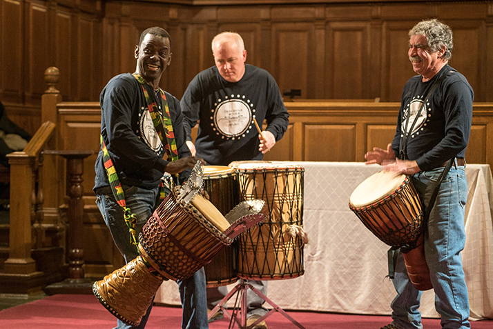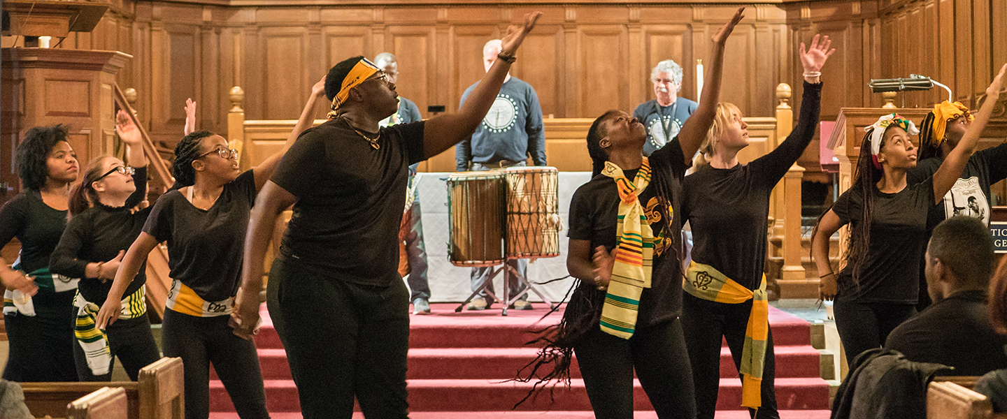 After introductory remarks and a land acknowledgment by Truth Hunter, director of Race and Ethnicity Programs, dance students who recently returned from studying abroad in Ghana performed a traditional dance accompanied by Africa drums played by the Crocodile River Music collective.