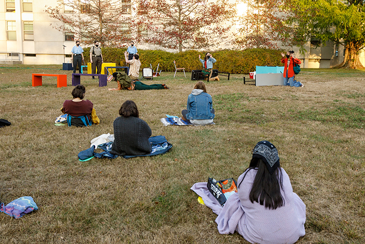 Staged outside in the “Fishbowl” near Harris Dining Hall, the performances and the logistics leading up to them posed unique obstacles for the cast and crew. For example, the actors all had to be fitted for costumes remotely, measuring themselves by following instructions over a Zoom video call.