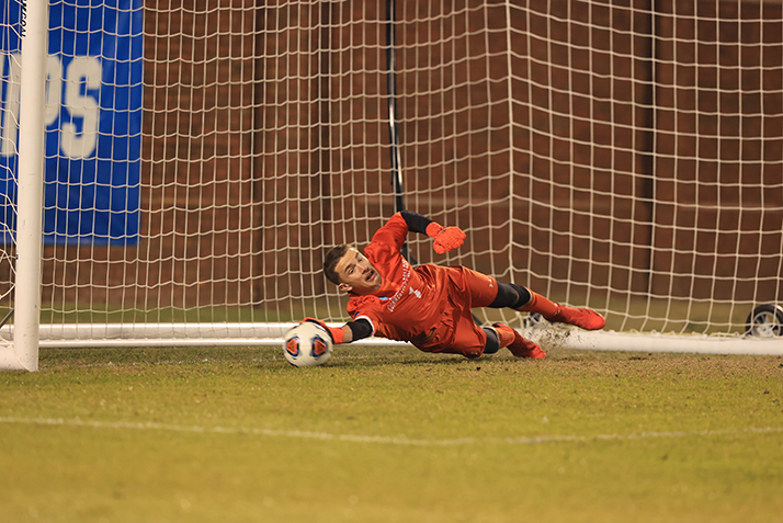 After playing Amherst to a 1-1 tie through regulation and two overtimes, senior captain Lorenzo Bocchetti ’22 converted the deciding penalty after Peter Silvester ’25 stopped two spot-kicks in the shootout.