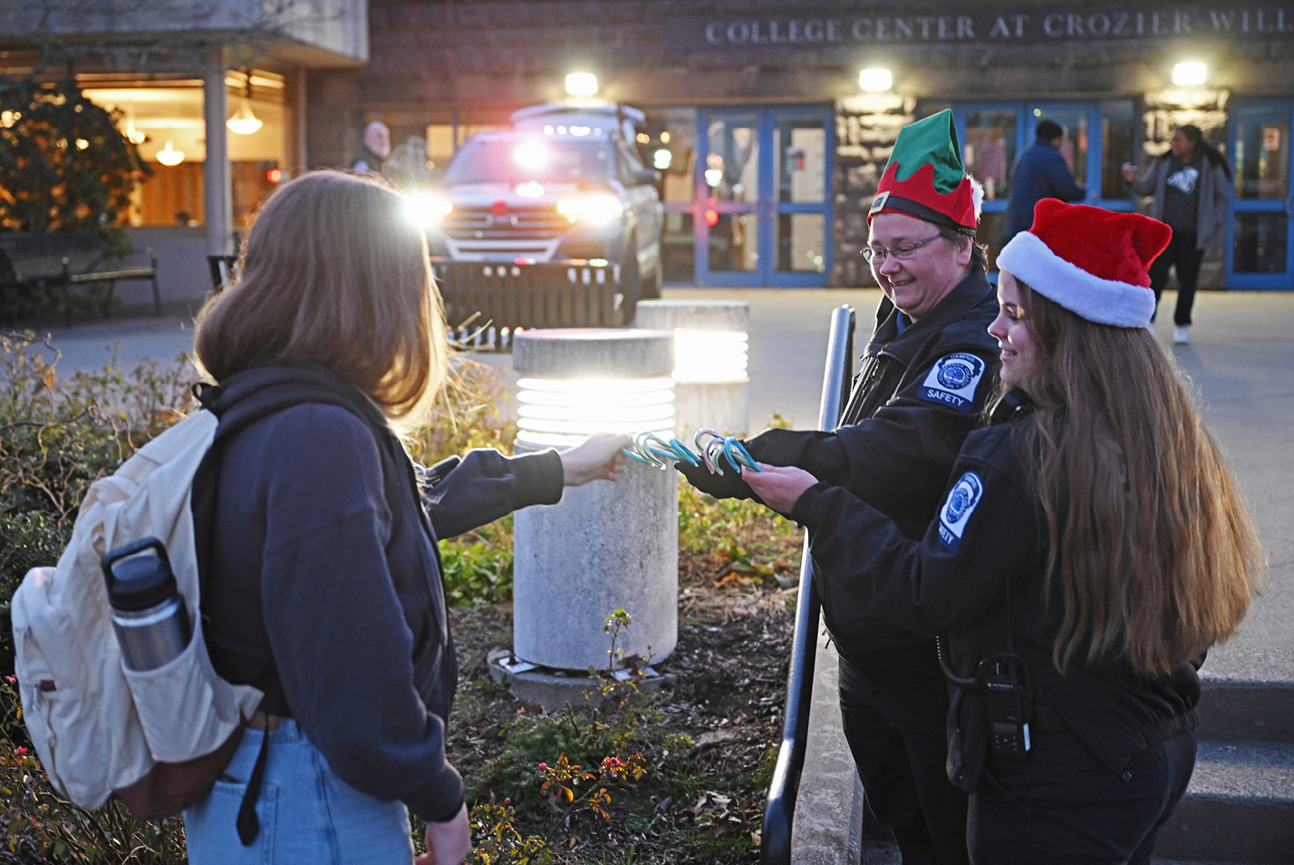Director of Campus Safety Mary Savage, left, collects food for the Gemma E. Moran United Way/ Labor Food Center.Campus Safety workers hand out candy canes in front of Cro during the Stuff-a-Cruiser food drive.