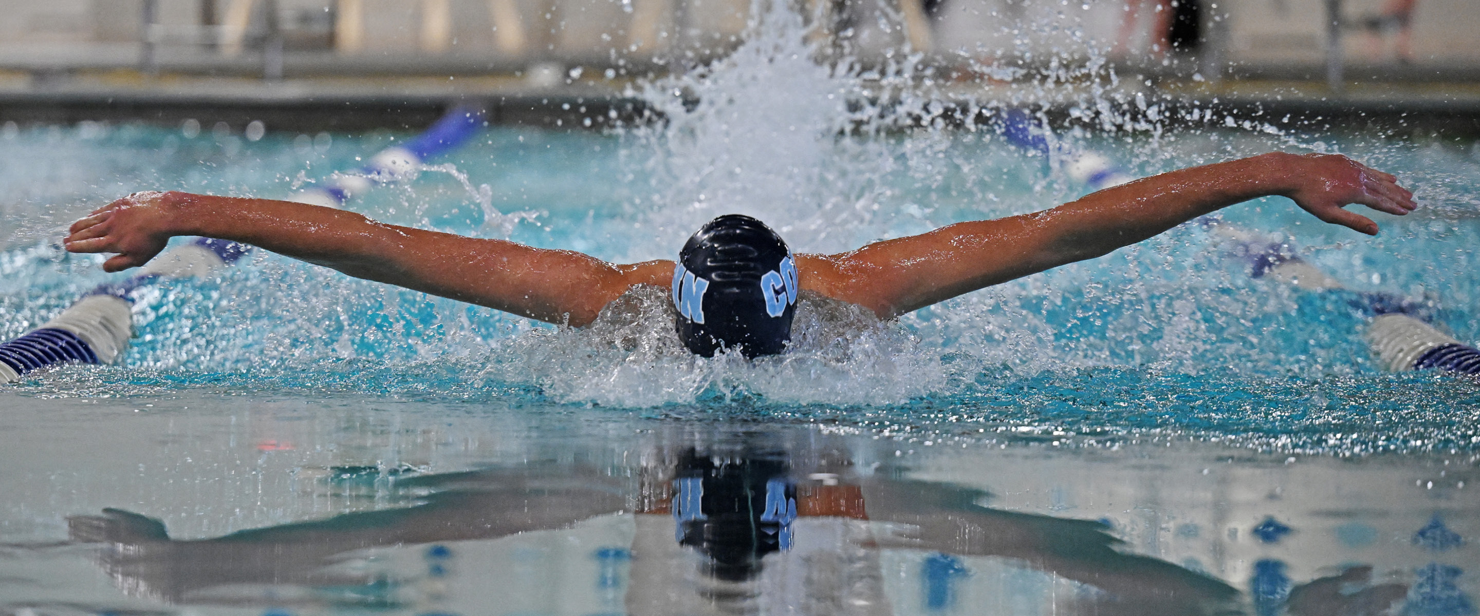 Evan Lyons ’27 dives in for the 200 freestyle during the tri-meet with Johnson & Wales and Trinity on Dec. 9.