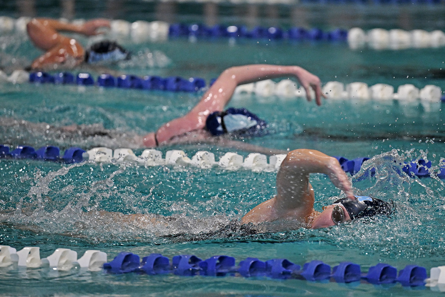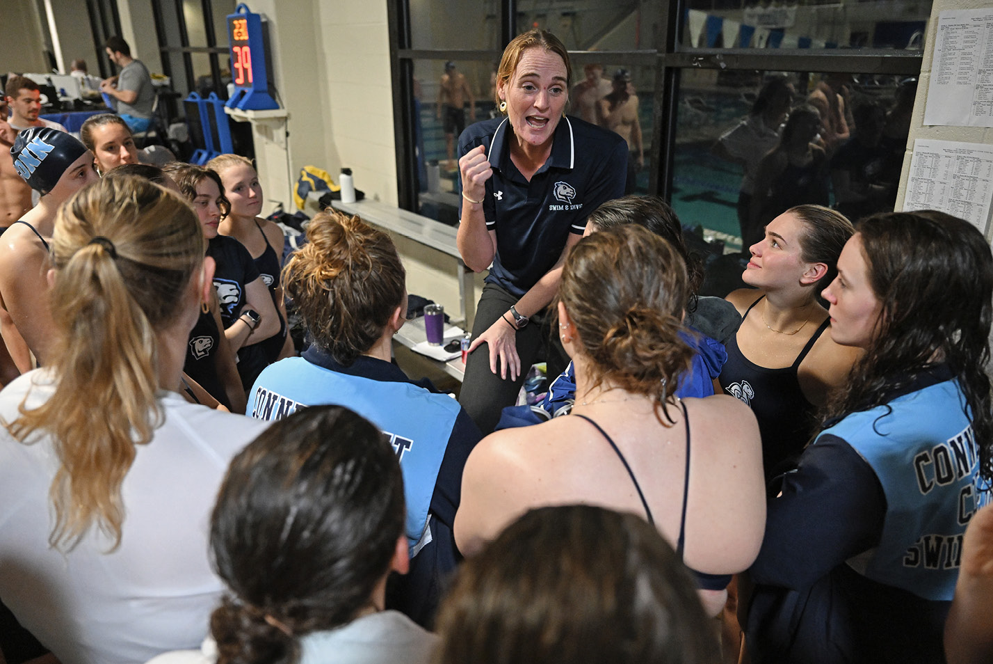 Lily Werges ’27 and Will Nash ’24 swim the mixed 1,000 freestyle in Conn’s men’s and women’s swimming tri-meet with Johnson & Wales and Trinity on Dec. 9 in Lott Natatorium. Women’s Swimming Head Coach Mindy Williams addresses her team.