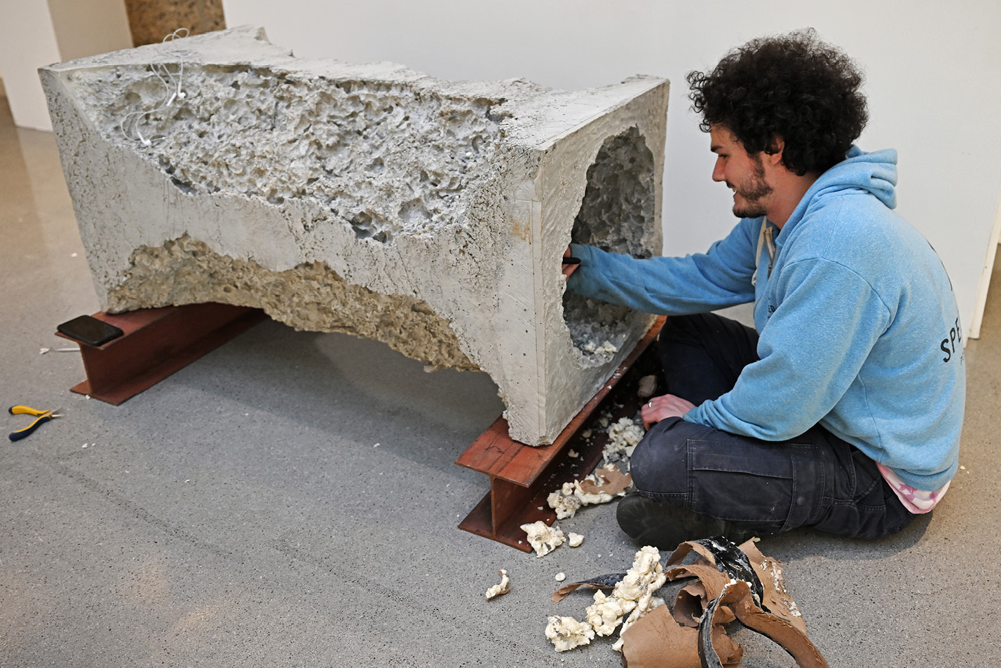 Sebastian Shames ’24 works on his concrete sculpture as senior art majors install their work for a mid-year critique in the Joanne Toor Cummings Gallery in mid-December.