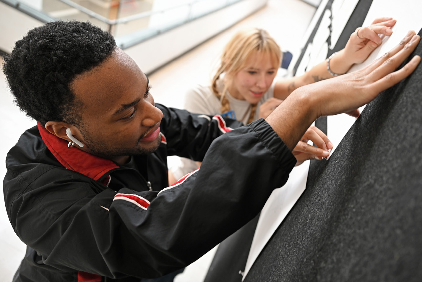 Sebastian Shames ’24 works on his concrete sculpture.Malachi Ward ’24 helps Ciara McNamara ’24 hang her work.