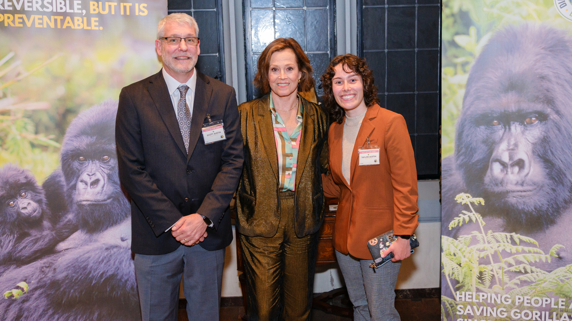 Austin, who describes herself as passionate about sustainability and conservation, supports the Fund’s goals of protecting the critically endangered Grauer’s gorillas in the Democratic Republic of the Congo and the endangered mountain gorillas in the Virunga mountains of Rwanda. She also wanted to meet Weaver. The film star’s recent work, which Austin characterized as “empowering, subversive and resistant to the stereotypes surrounding older women in film,” inspired her senior thesis, “Aging on the Margins: The Older Woman as a Queer^ Subject.”