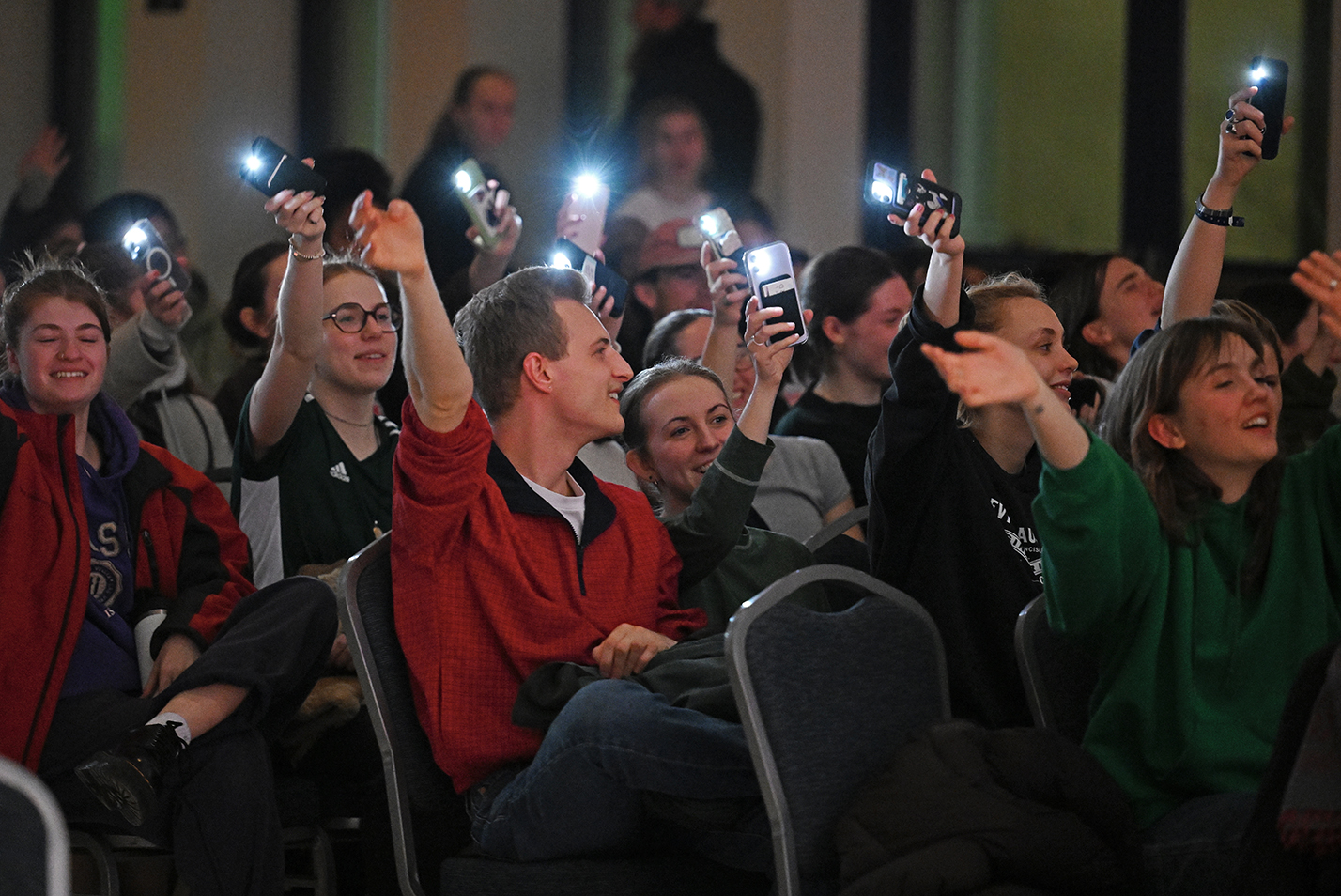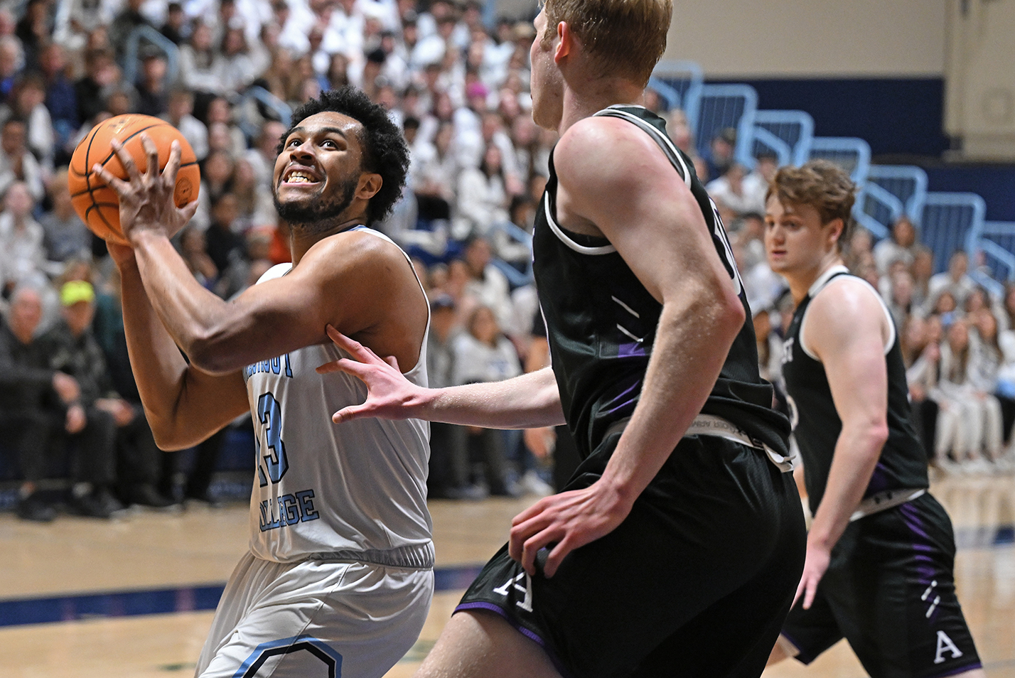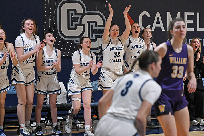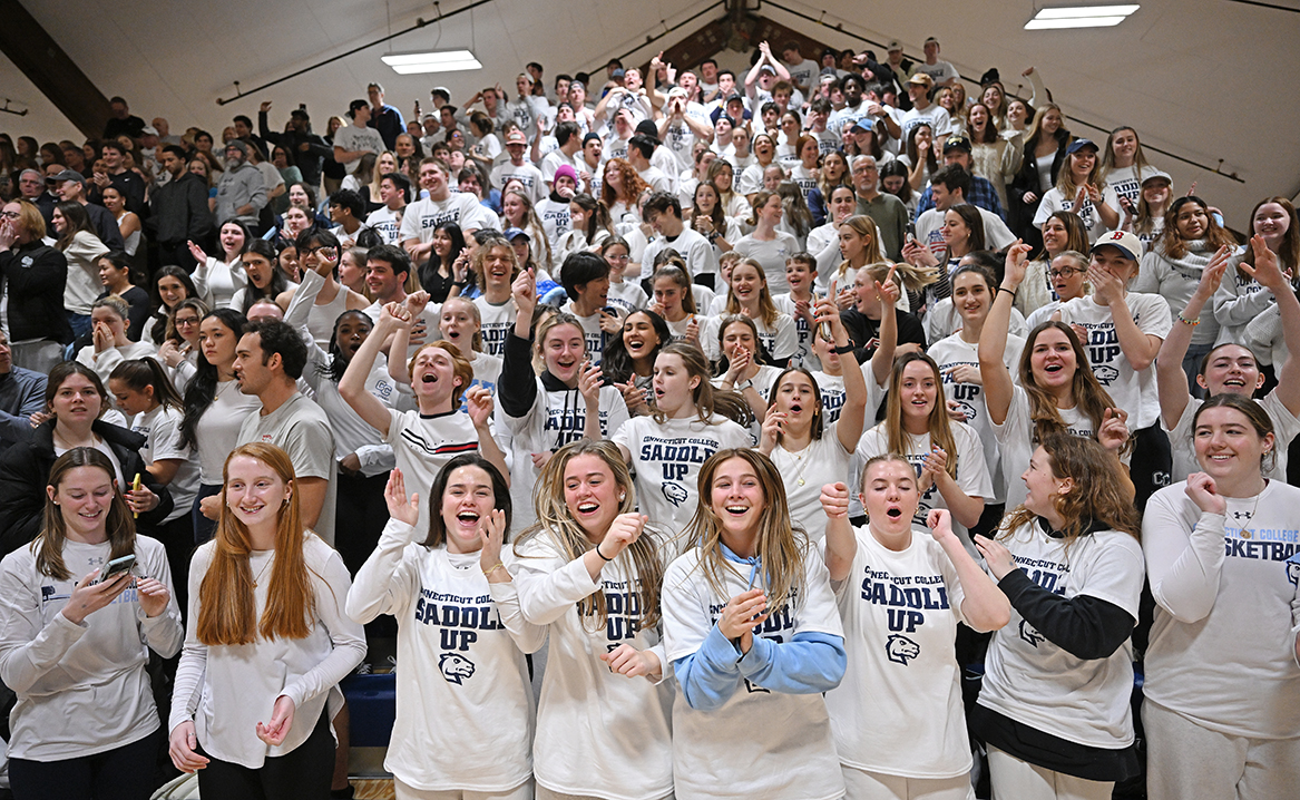 A raucous student section cheers on Conn’s Men’s Basketball team against Amherst College in the quarterfinals of the NESCAC Championship tournament at Luce Field House.