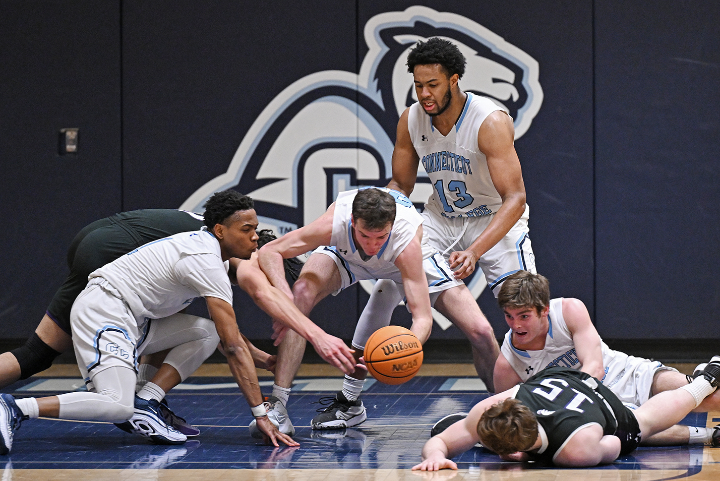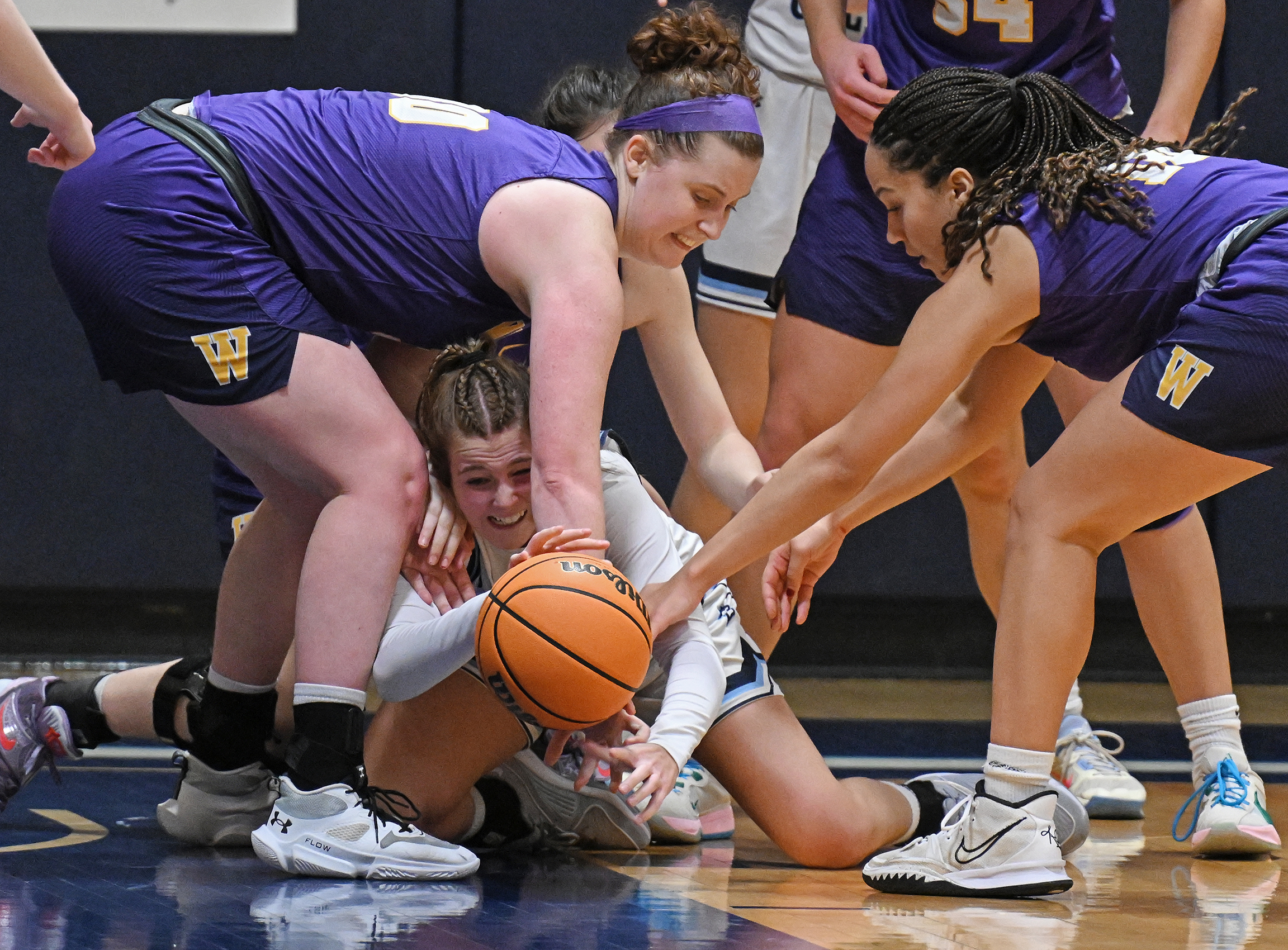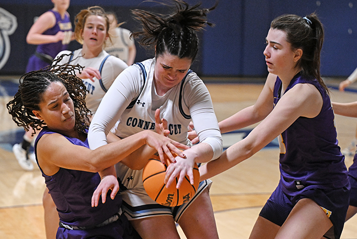 Women’s Basketball guard Catie Donadio ’25 battles for a loose ball against Williams College Feb. 11. The Camels closed out the season with a 65-58 win on Senior Day.