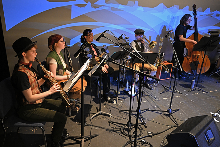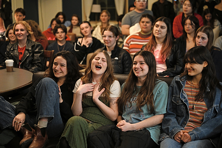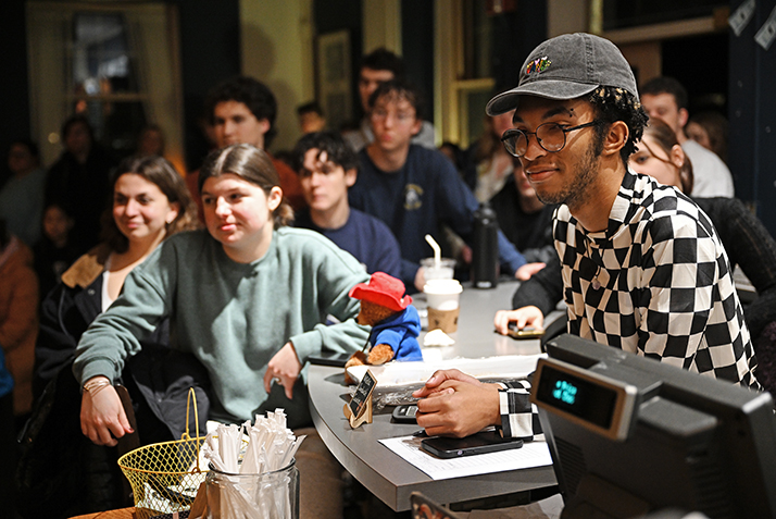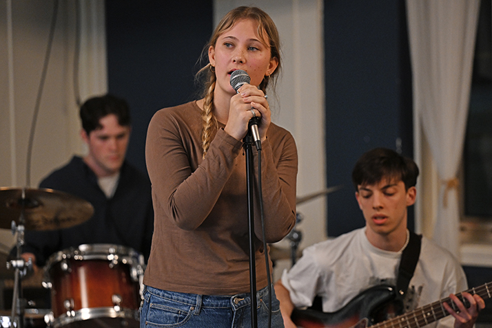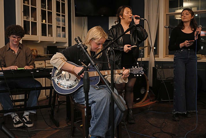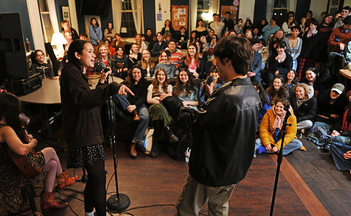 Miya Lasher ’27, left, and Elvin Yi ’27 perform for a packed house during the Musicians Organized for Band Rights on Campus (MOBROC) open mic night at the Coffee Closet at Ruane’s Den.