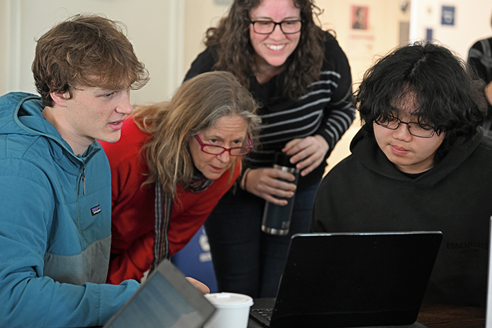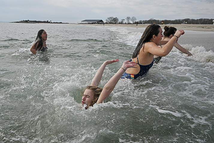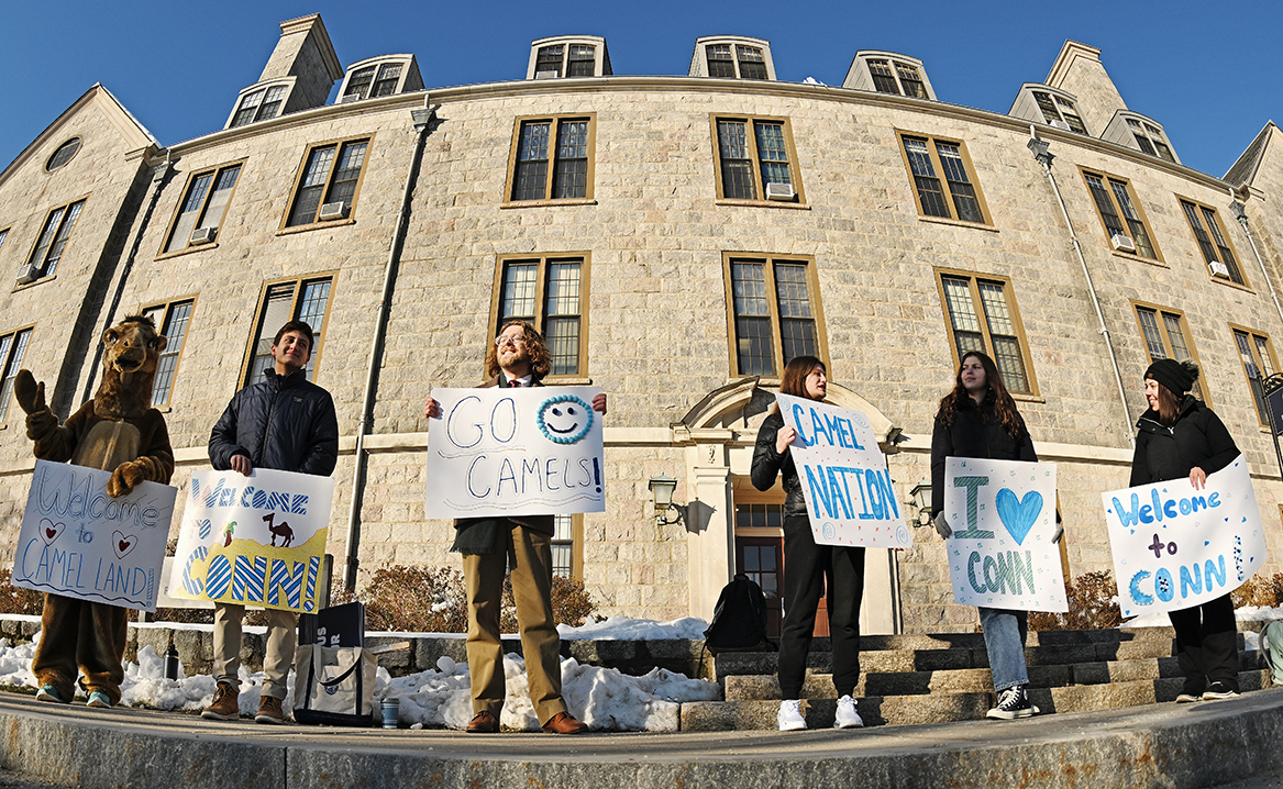 The Connecticut College Camel and a team of student Admission workers greet prospective students at the main entrance to campus for a spring Open House event. High school students and their families are invited to visit campus during the final spring Open House on Friday, March 29. Learn more.
