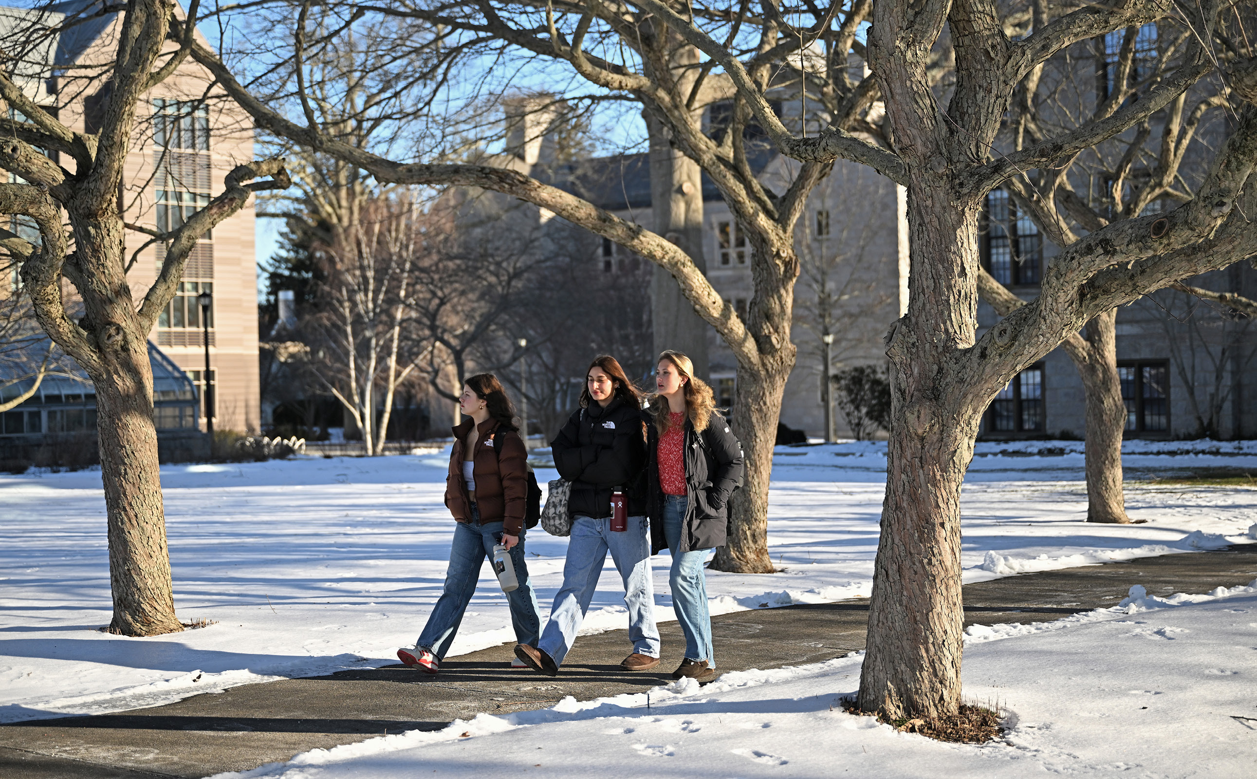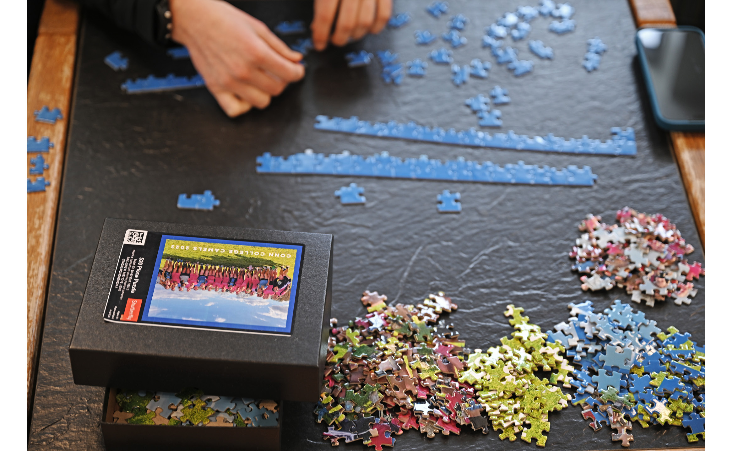 Abby Fernald ’26, left, and Grace McDonough ’26 work on a Conn-themed jigsaw puzzle in the Harris Commons on Jan. 9.