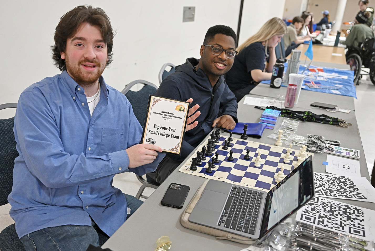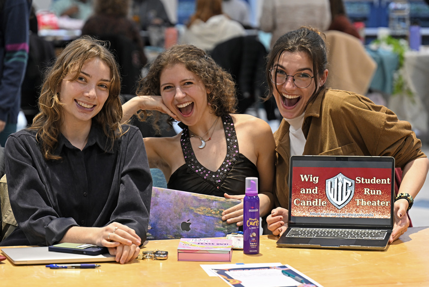 Members of the Chess Club show off their Top Four Small College Team award from the 2024 Pan American Intercollegiate Team Chess Championship during the Student involvement fair in the 1962 Room on Jan. 26.(L-R): Sophia Bianchi ’26, Grace Flynn ’25 and Ali Rubin ’25, all members of the student-run theater club, Wig and Candle, host a table at the Student Involvement Fair.