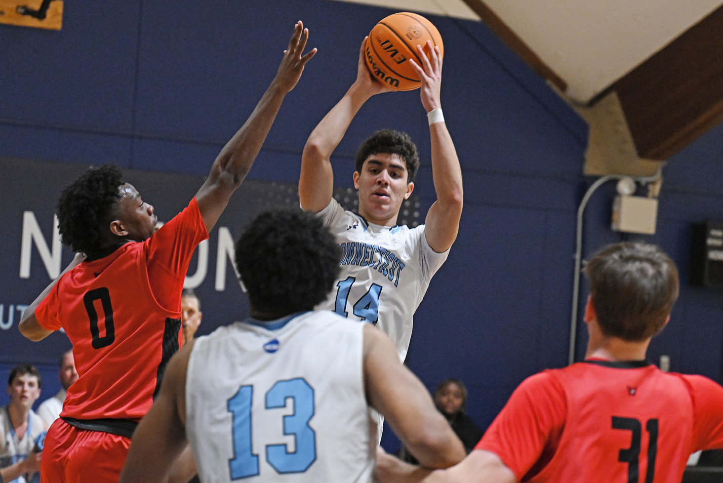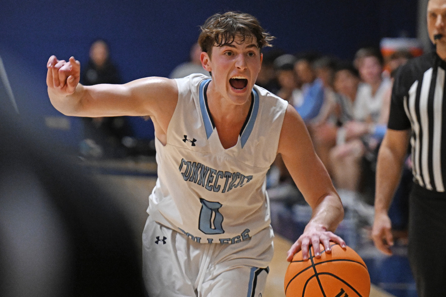Cam Schainfeld ’25 rallies against Wesleyan. The Camels got hot, going on a five-game winning streak at the end of January and into early February.Elias Espinosa ’27 leaps over Wesleyan defenders for the shot.