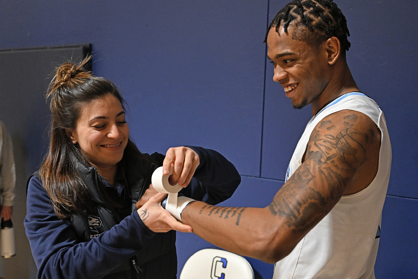 Interim President Wong cheers on the men’s basketball team at home.Trainer Sarah Acerbo tends to guard Jarron Flynn ’24 at Luce Field House.