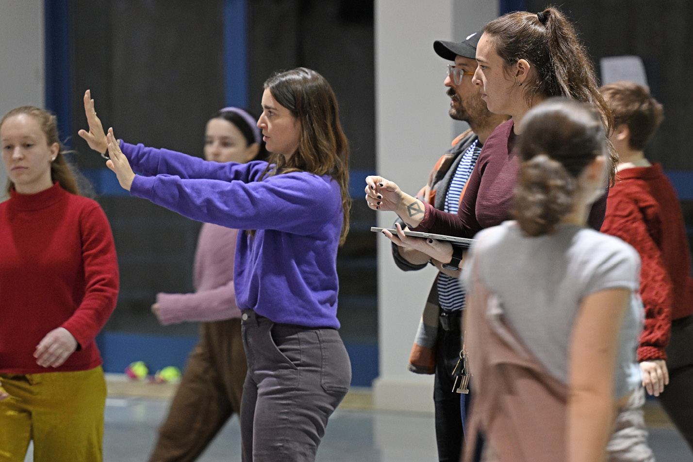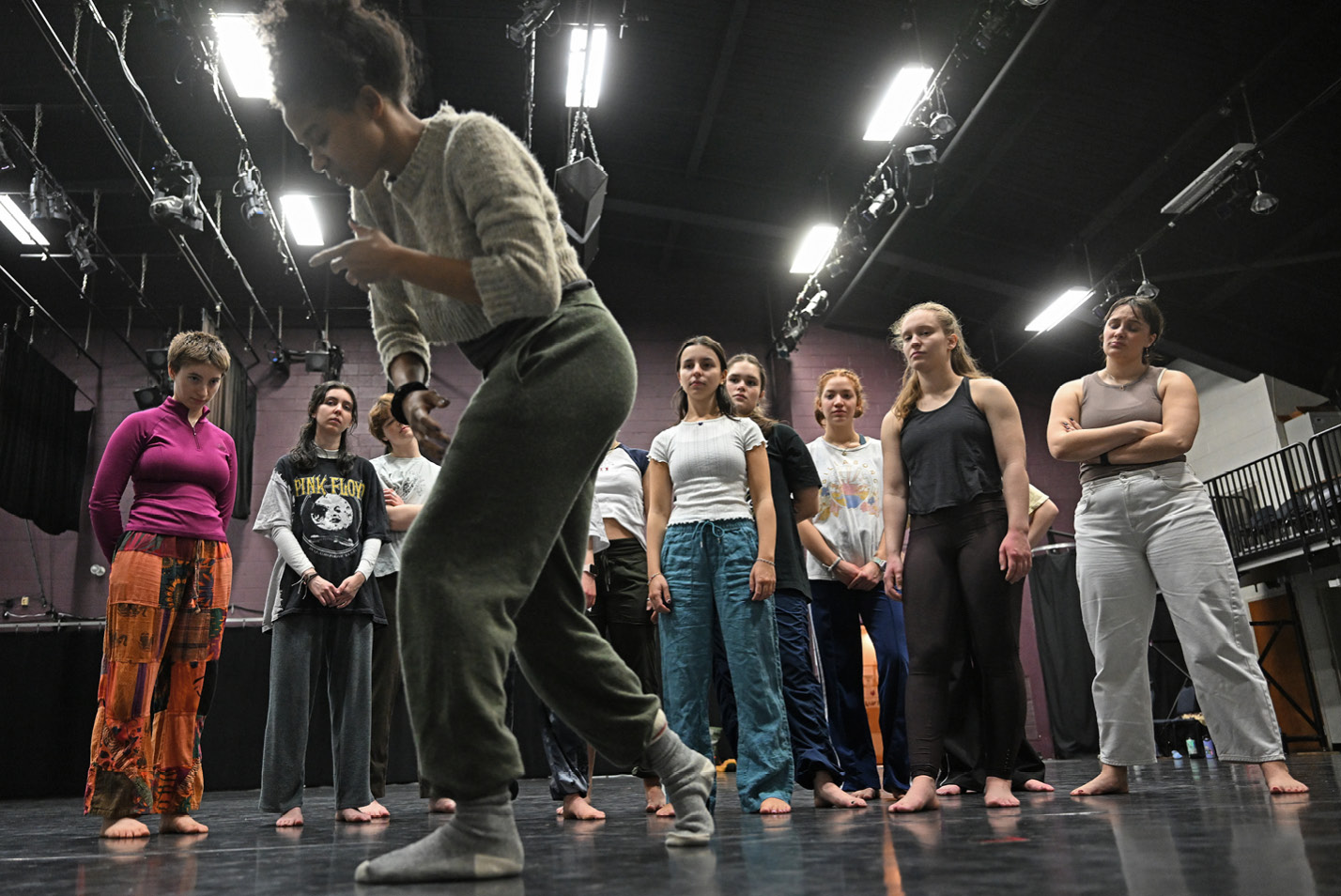 The cast of the Theater Department production of “Urinetown” rehearse the opening number choreography with Emily Brankman ’26 in Tansill Theater on the second day of a week-long intensive. The show will be performed March 1 and 2 in the Athey Center at Palmer Auditorium.