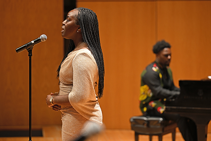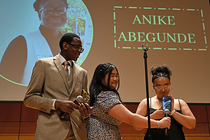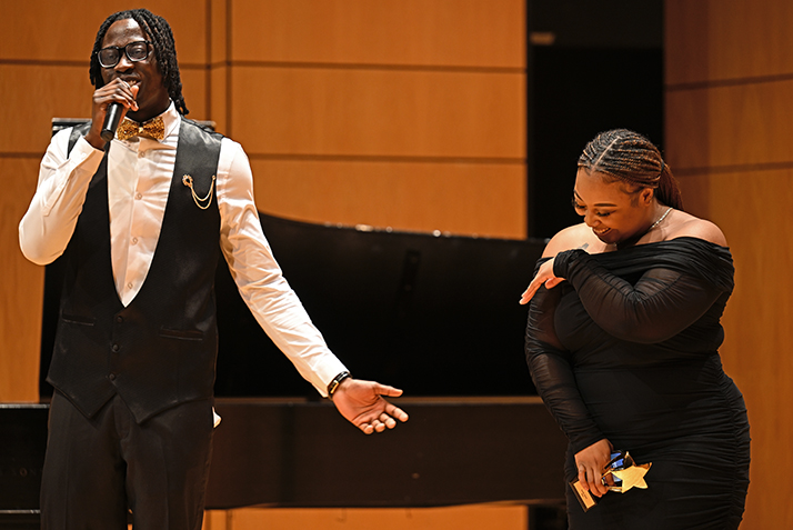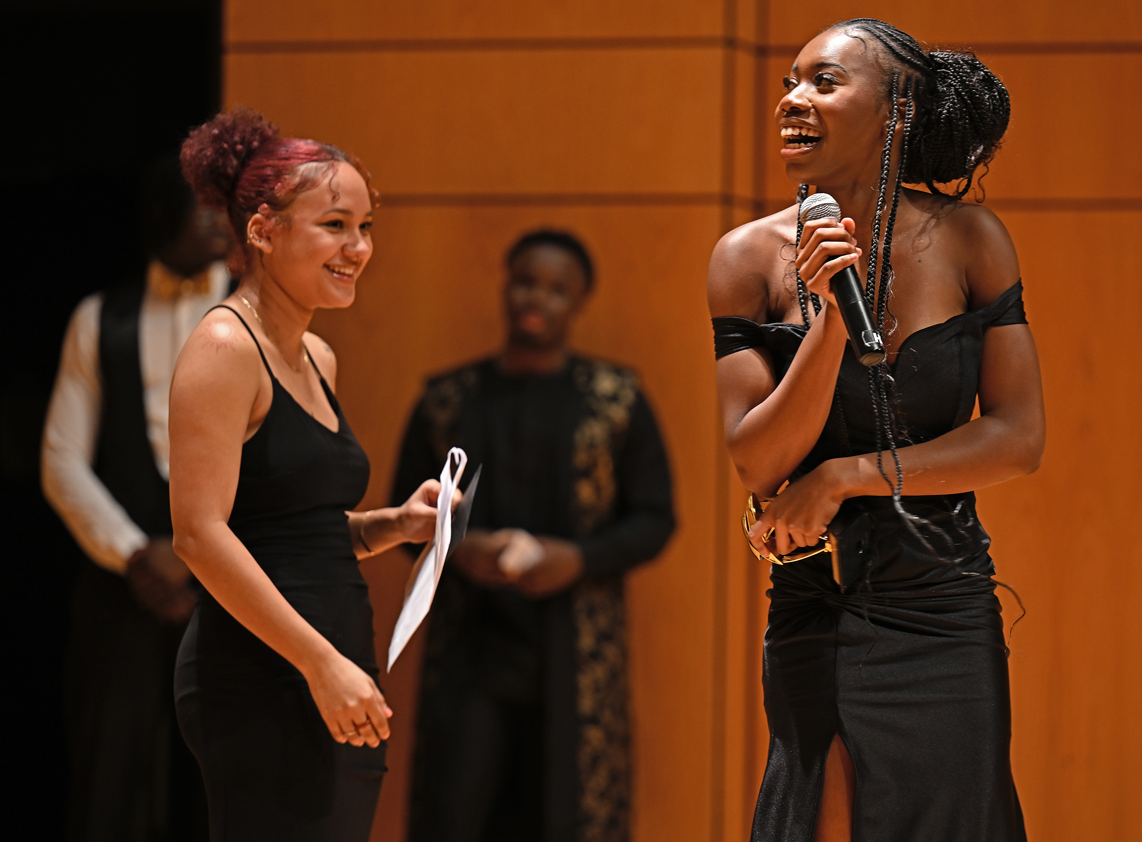 Carmen Nimako ’26, right, accepts the Small Business of the Year Award from Sauriely Canals ‘26, left, during the African Student Association’s inaugural Asante Awards Gala in Evans Hall.