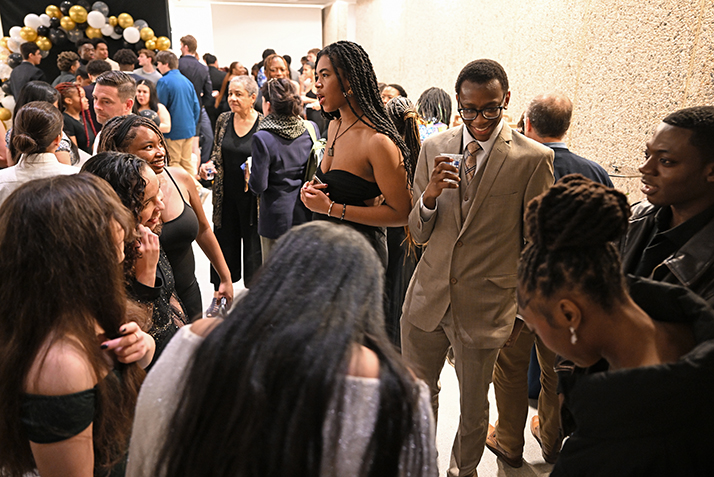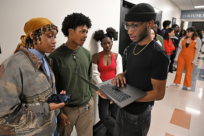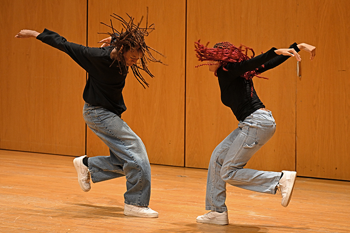 As People of Color Alliance Fashion Show participants practice in and around Evans Hall, Moises Chiquito ’24 takes a photo of Kwadwo Taah ’24 while Hope Kisakye ’26 and Adeyosola Ajayi ’26 await turns in the studio. The show, “Roots that Bind,” is Sunday, April 7, in Cummings Arts Center.