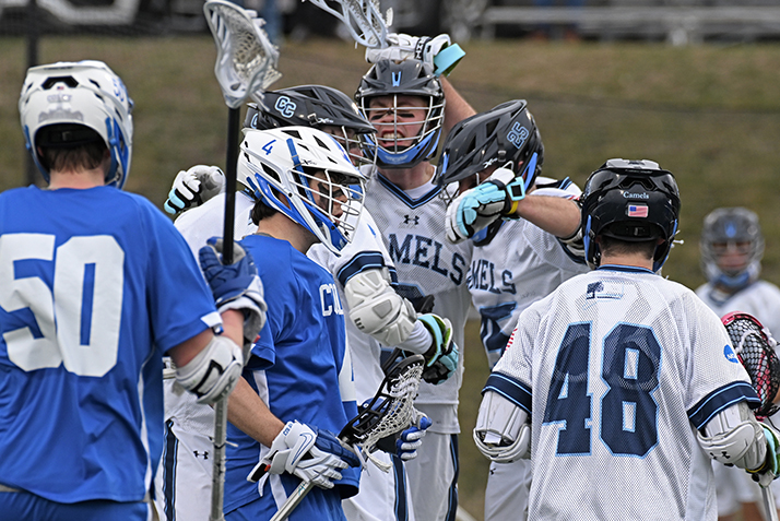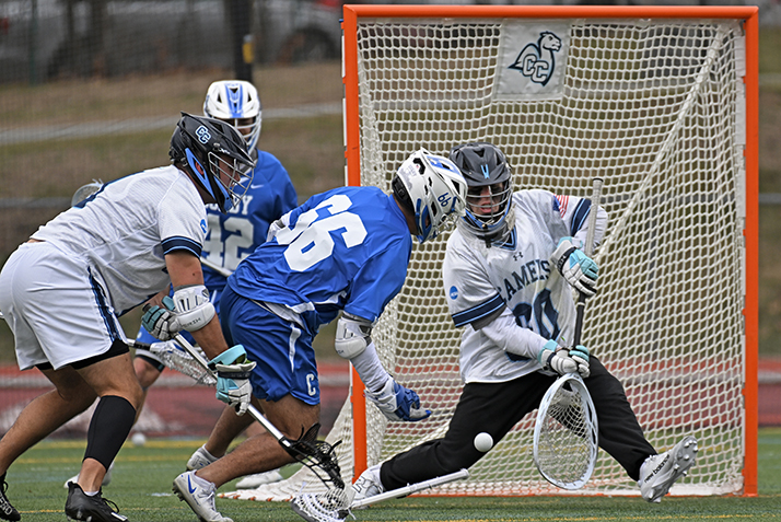 Women’s lacrosse attack Janet Howard ’24 battles her Tufts opponent for the ball during the team’s March 2 home opener on Silfen Field.