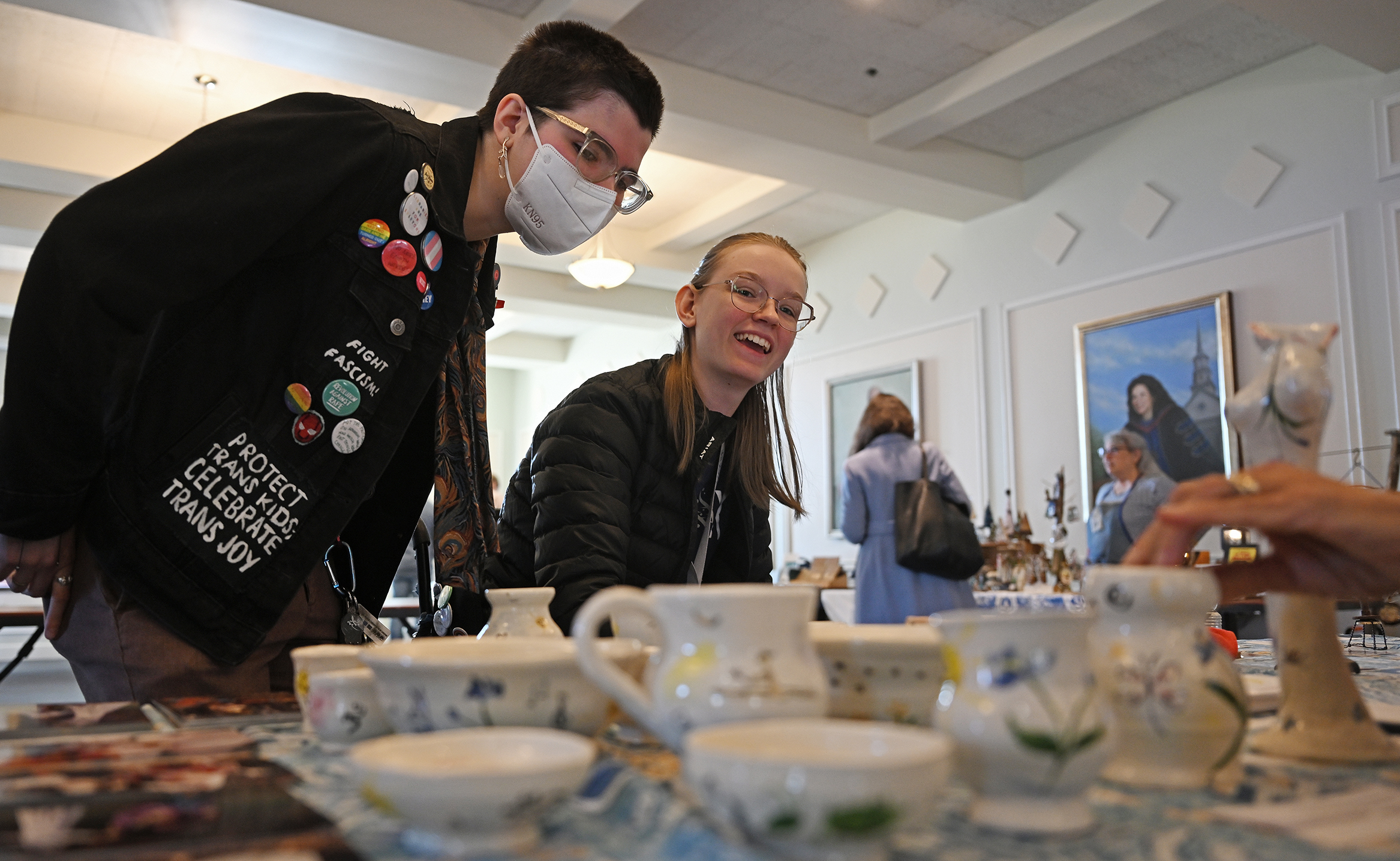 Westley Cardani ’26 and Anna Vredevoogd ’26 look at some of the wares offered at the Connecticut College Craft Fair in Ernst Common Room and Hood Dining.