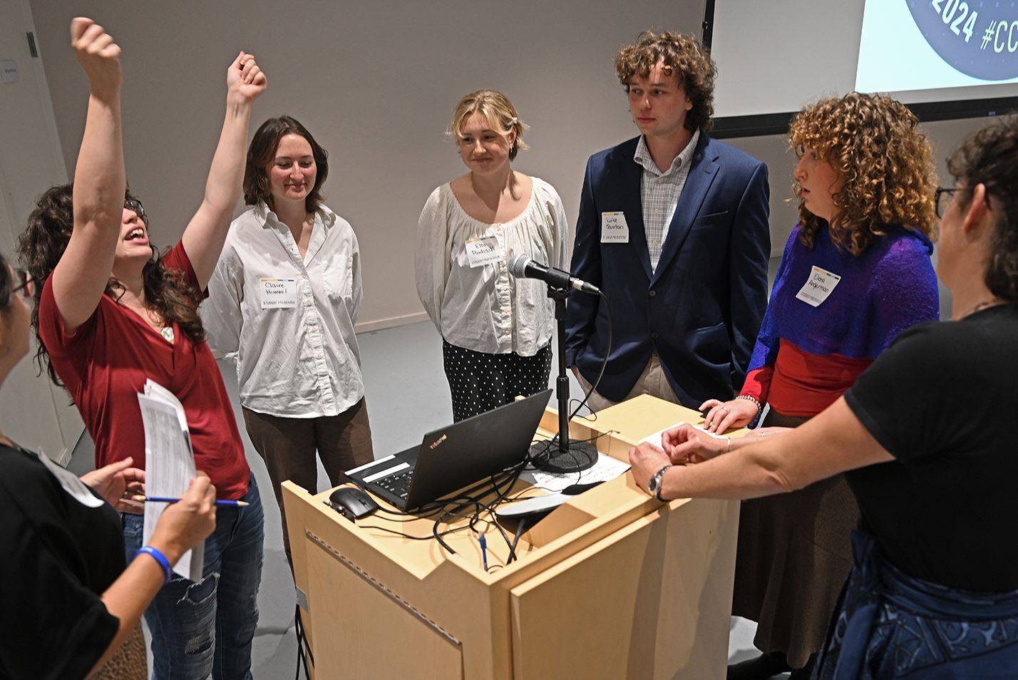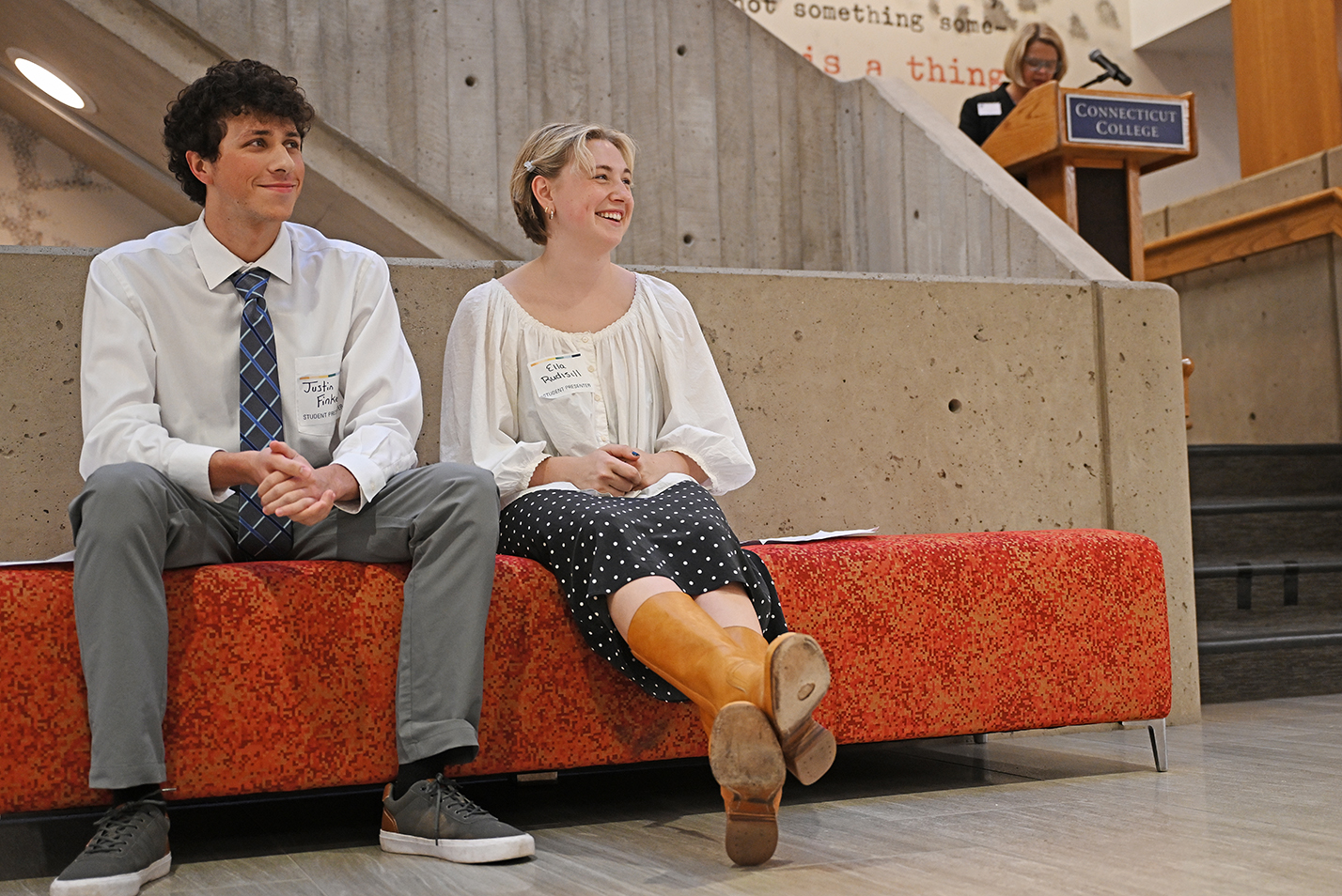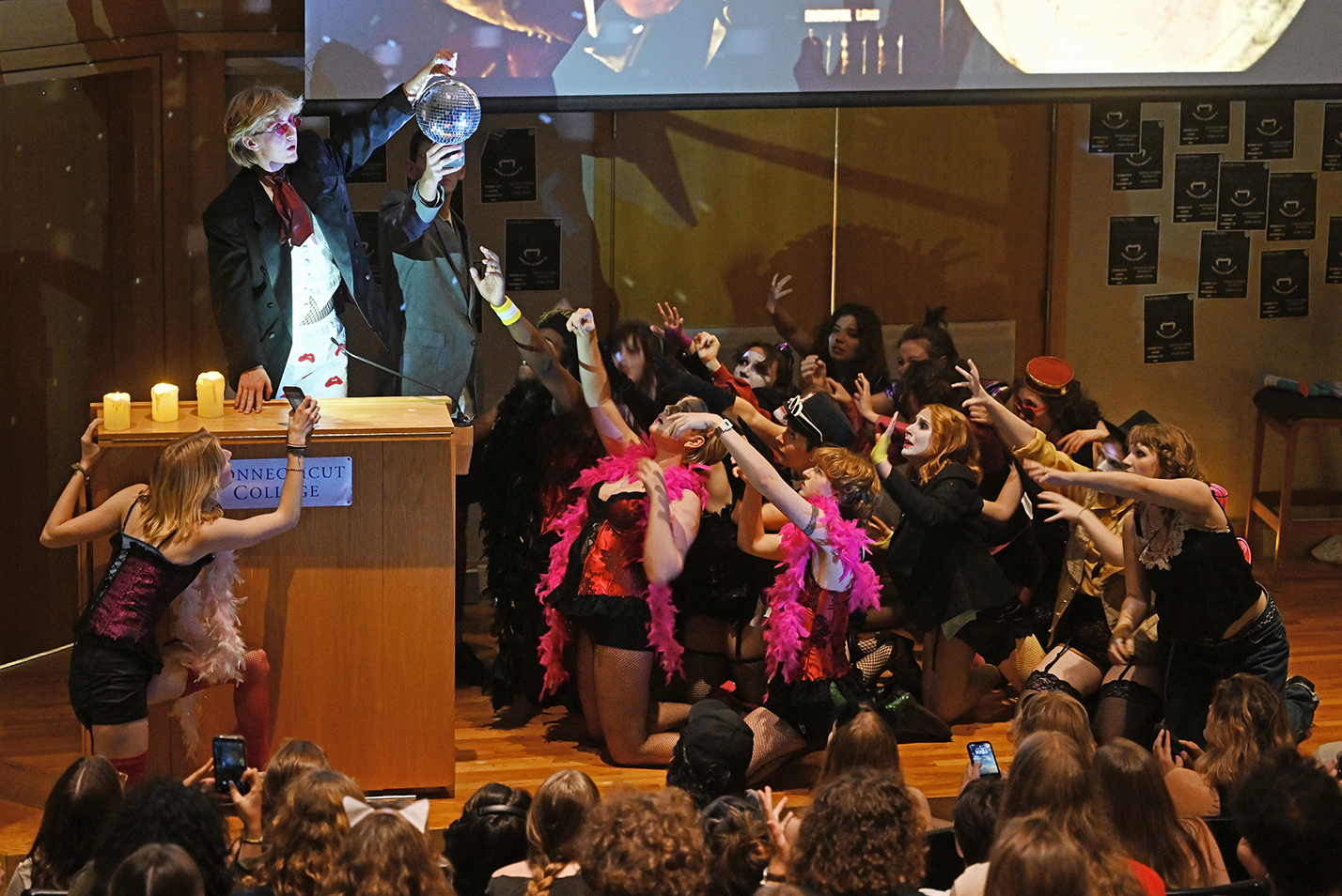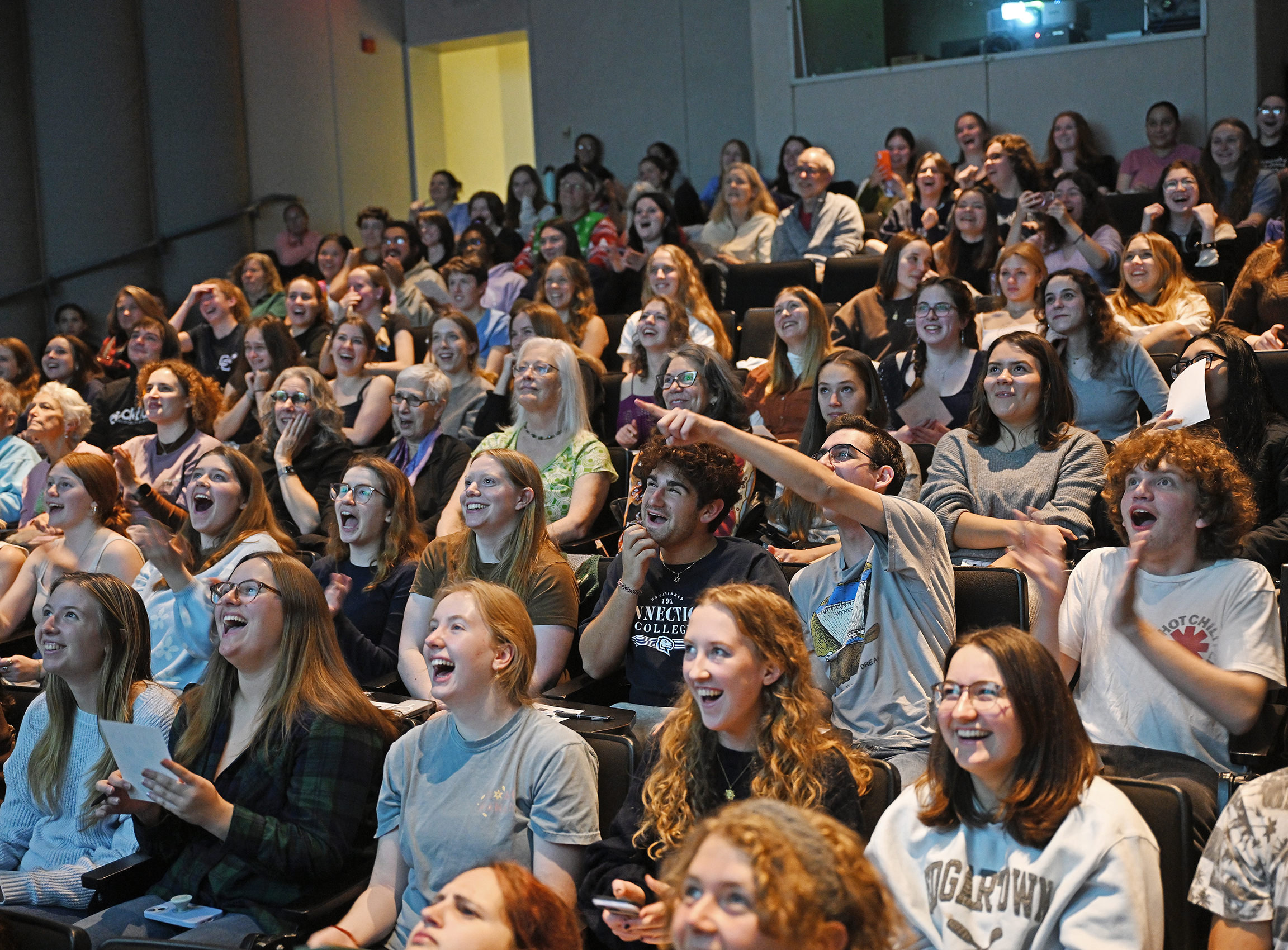 Members of the Conn community gathered in the Olin Hall auditorium for a screening of Hallmark’s “Trivia at St. Nick’s.” The holiday movie, which premiered as part of Hallmark’s annual “Countdown to Christmas” series on Nov. 8, was filmed largely on Conn’s campus in late June and early July, and several students served as extras. Read more.
