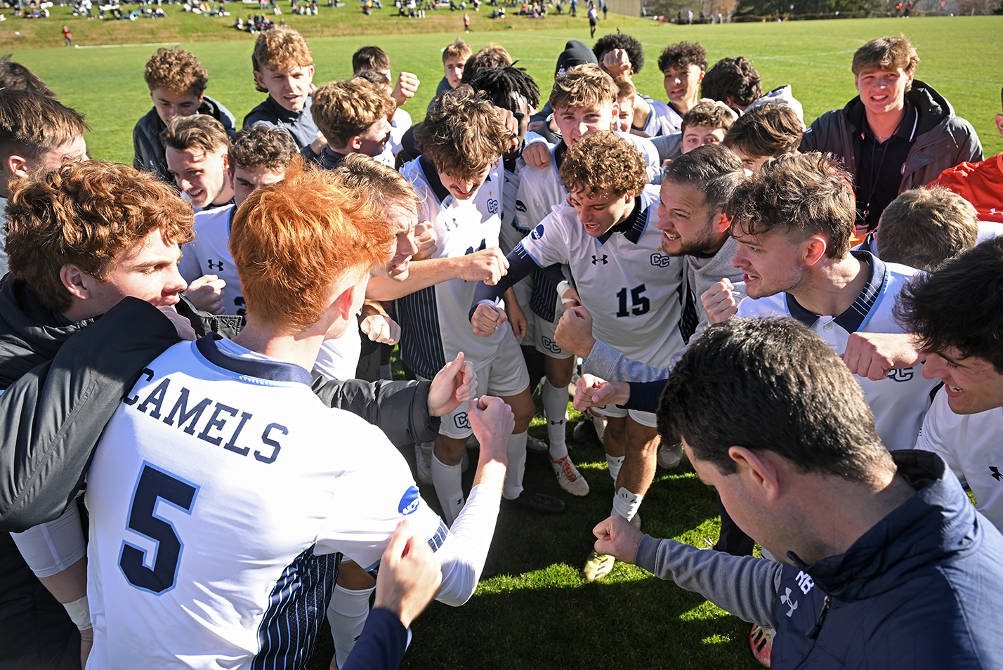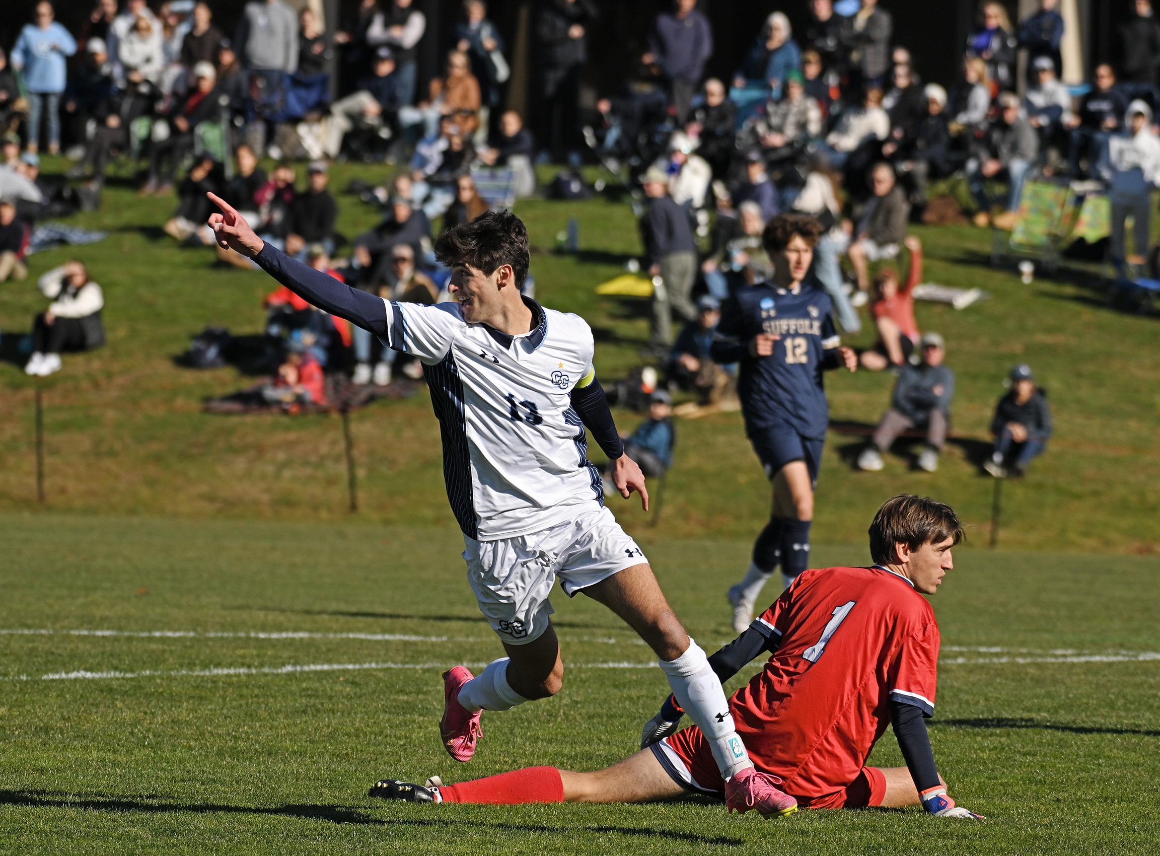 Men’s Soccer forward Matt Scoffone ’25 celebrates after scoring the opening goal just five minutes into NCAA DIII tournament action against Suffolk University on Freeman Field. The Camels were undefeated in the month of November, winning the NESCAC Championship and punching their ticket to the NCAA Final Four.
