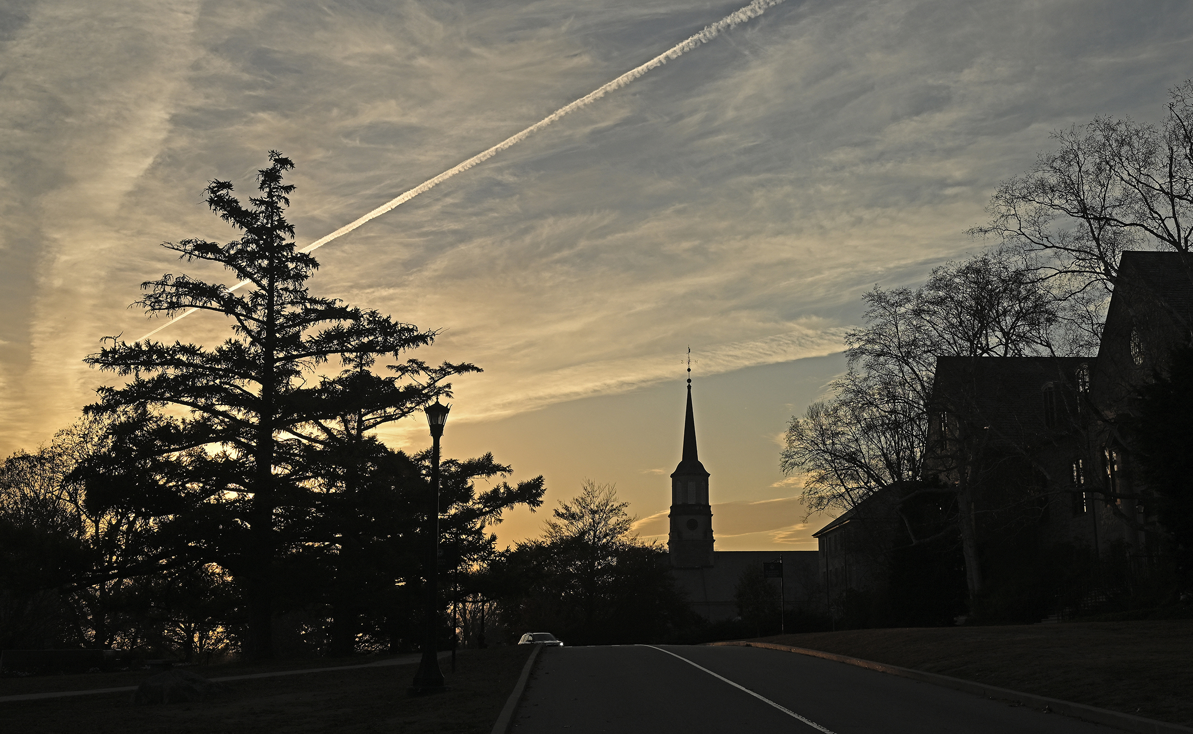 Harkness Chapel stands out against the sky at dusk.