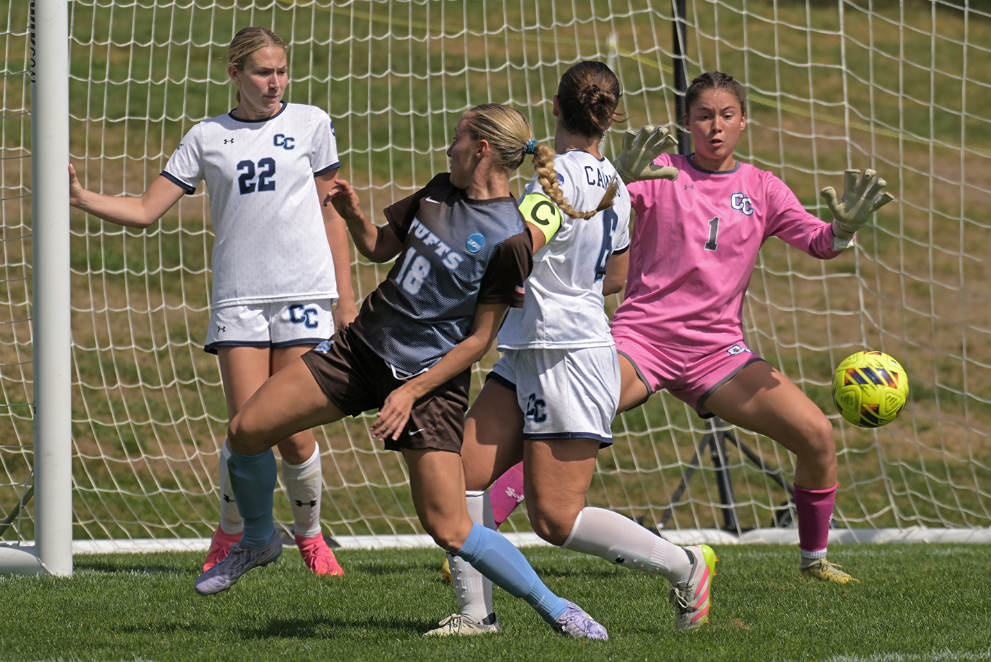 Field Hockey forward Elizabeth Bonner ’28, left, and midfielder Kellyn Scheel ’27 celebrate after Conn scored against Colby College in NESCAC action on Silfen Field. Bridget McGann ’26 notched two goals in the team's 3-2 victory.