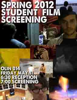 Students in the Connecticut College Film Studies Program will screen their latest projects on Friday, May 11, at 7 p.m. in Room 014 of Olin Science Center. This evening's lineup includes films in a variety of genres, from fiction to documentary and experimental to animation. All will be shown in high definition. "This semester we've got another incredible group of students who have created exciting, dramatic, funny and thought-provoking work," said Ross Morin, assistant professor of film studies. "They've welcomed - and met - the challenge of rising to some very high expectations. We're proud to be screening their work." The student film screening is free and open to the public.