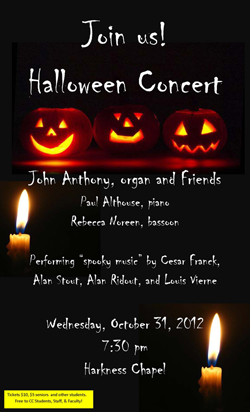 As darkness descends on the scariest night of the year, Harkness Chapel will echo with the haunting melodies of the annual Halloween Concert by Professor of Music John Anthony and friends. On Wednesday, Oct. 31, at 7:30 p.m., Anthony will be joined by Professor of Music Paul Althouse on a duet for piano and organ by the French Composer Cesar Franck and Adjunct Professor of Music Rebecca Noreen on several spooky selections for bassoon and organ. Anthony will also perform music by Louis Vierne, a composer and principal organist at the cathedral of Notre Dame de Paris. This year is the 75th anniversary of his death, which occurred while he was performing at Notre Dame. Of this beloved concert tradition, Anthony has said, "We like to showcase some spooky music, and the chapel provides just the right atmosphere. Together, the music and setting create an otherworldly experience that's perfect for Halloween." If you dare, put on a costume and come to Harkness Chapel for the concert. Tickets are $10 for general admission and $5 for students and seniors. The performance is free for Connecticut College staff, faculty and students.