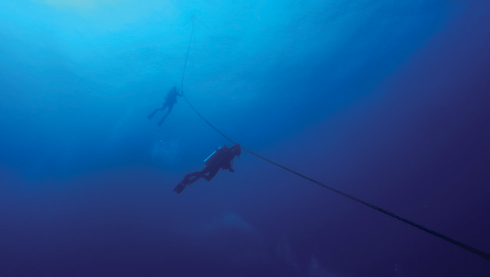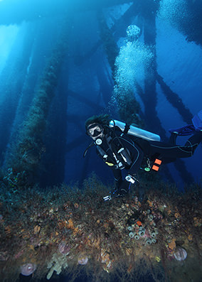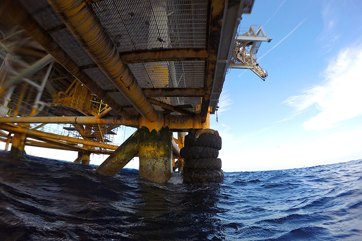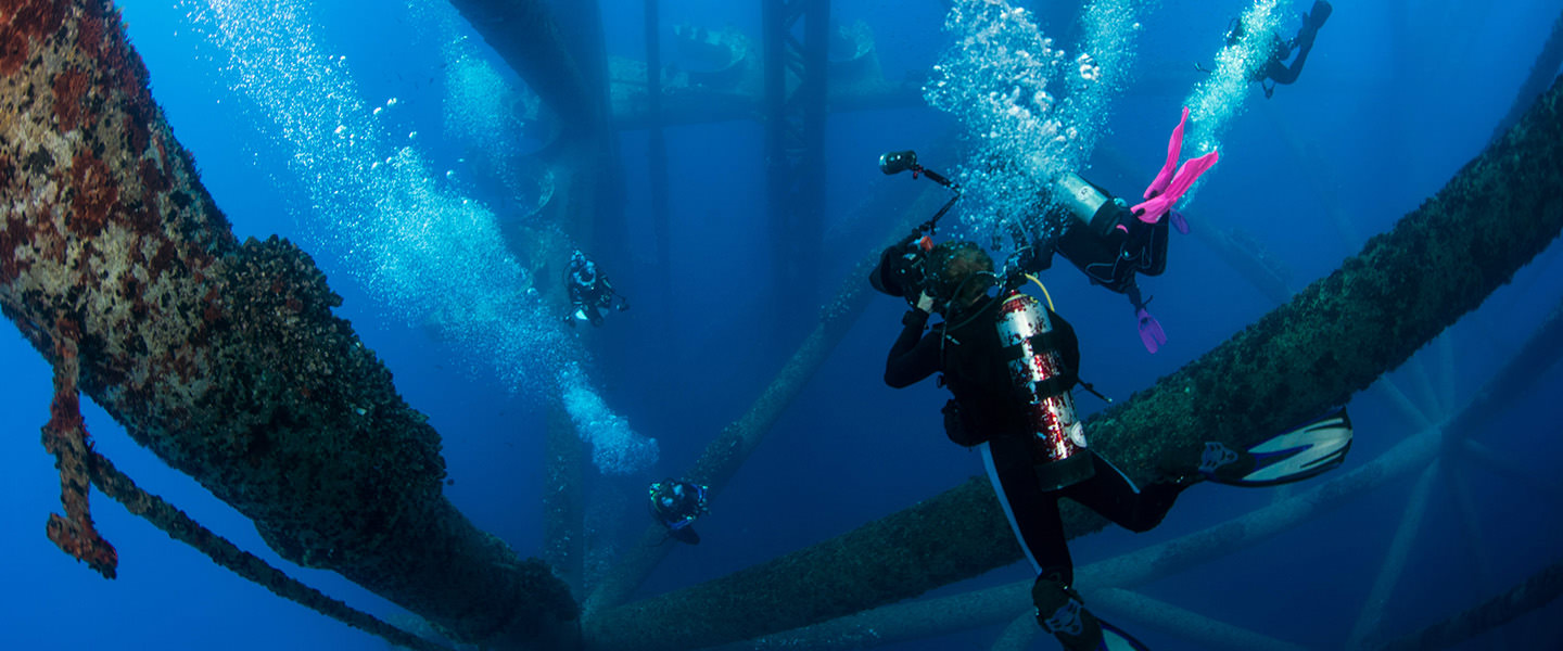 A scuba diver, standing on the deck of the boat and covered by a seal-colored, neoprene wetsuit, isn’t looking up at the rig, however. She’s looking down at the water. Like an iceberg, it’s what lies beneath the surface—what you don’t see—that holds the most wonder.