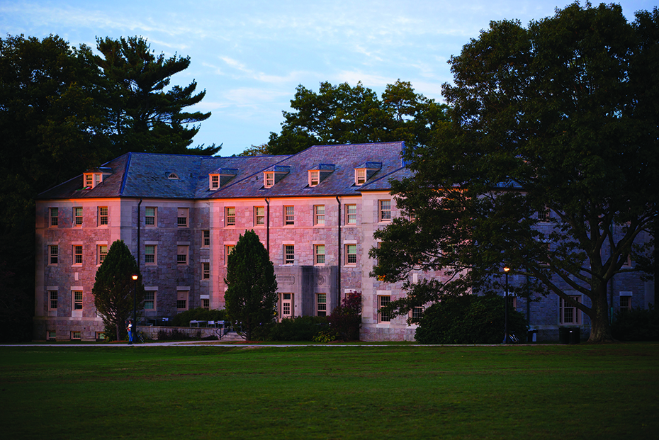 The breaking dawn gives a rosy tinge to the east face of Mary Harkness House residence hall, built in 1934. Granite for the campus's original buildings was quarried from outcrops on land that is now part of the Arboretum.