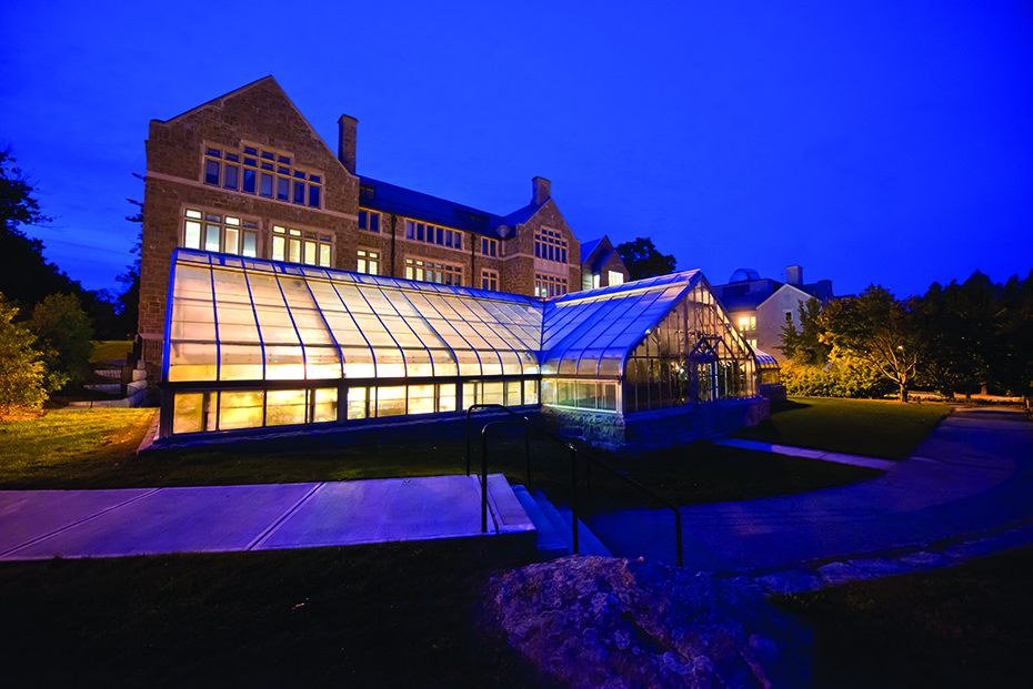 The greenhouse of New London Hall glows at night, while cactus, orchids and other plant collections inside soak up artificial light. Each year, introductory botany students plant and tend a small garden plot of their own design within the structure. The greenhouse is also home to plant collections used for faculty and student research.