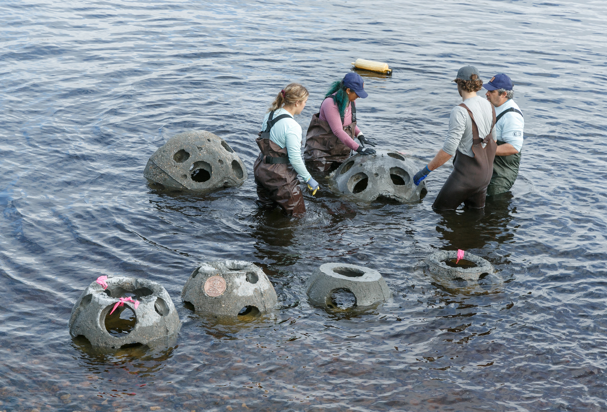 The Camel's Reef project, led by Professor Maria Rosa, uses reef balls to minimize erosion and buffer wave activity that could cause damage to our docks and boats. Reef balls are created by pouring marine-friendly concrete into molds to create a hollow center and voids for marine life to grow in. Our reef balls were constructed on campus by students, faculty and commnunity volunteers. The first reef balls were deployed into the Thames River in October 2021.