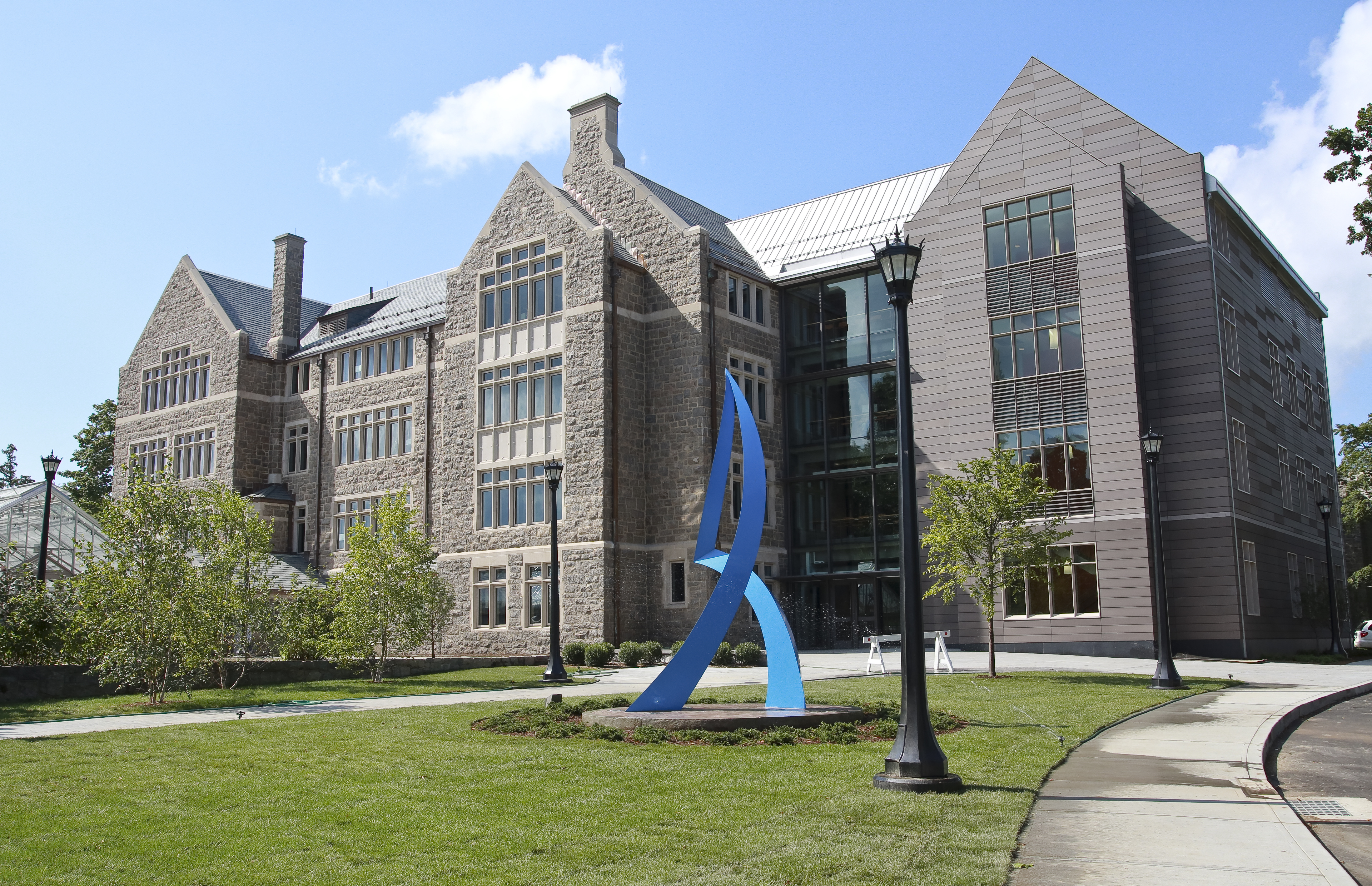 From 2011-2012, New London Hall underwent an extensive sustainable renovation and extension. The installation of a geothermal system made the building the first on our campus fully heated and cooled by a renewable energy source. Other sustainable feature include high-efficiency lighting and laboratory hoods, water saving plumbing, and the reuse of historic wood trim and doors. The building was certified LEED Gold by the US Green Building Council in 2013.