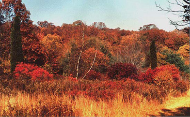 The autumnal aspects of our Arboretum area are especially striking. Highbush blueberry and huckleberry lend their distinctive reddish tones and hold their leaves late into fall. On the tall columnar red cedar, Virginia creeper adds a spark of red within the dark green. In winter the evergreen cedars and the spreading trunks of gray birch lend a striking contrast to the tans of dried grasses. In spring the flowering dogwood bursts forth in a cloud of white. This is the potential in store for you.