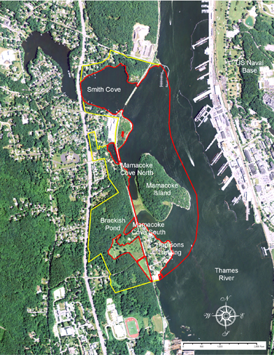 The National Audubon Society has recognized the shoreline of the Thames River between Harrison’s Landing and Smith Cove in Quaker Hill (Waterford) as an Important Bird Area for Connecticut. Important Bird Areas constitute a network of sites in the United States and other countries that provide critically important habitat for bird populations. The site on the Thames River centers on Mamacoke Island, which is a designated natural area within the Connecticut College Arboretum. It includes three coves and two salt ponds that provide important habitat for a variety of ducks that spend the winter in Connecticut. Smith and Mamacoke coves are especially important as feeding areas for ducks during periods of intense cold during mid winter when freshwater lakes, reservoirs and rivers are covered with ice.