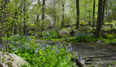 The Edgerton and Stengel Wildflower Garden is filled with wildflowers, ferns and a shrub layer of native azaleas and rhododendrons. Sheltered by a canopy of white ash and red maple, this naturalistic garden displays its beauty on a west-facing slope. The remains of stone walls are reminders of the original agricultural use of the land. Wildflowers are able to survive without the intervention of people and they add to the natural beauty of any setting. One of the best times to visit is late May when the flowers are in bloom. Come by for a tour in the spring!
